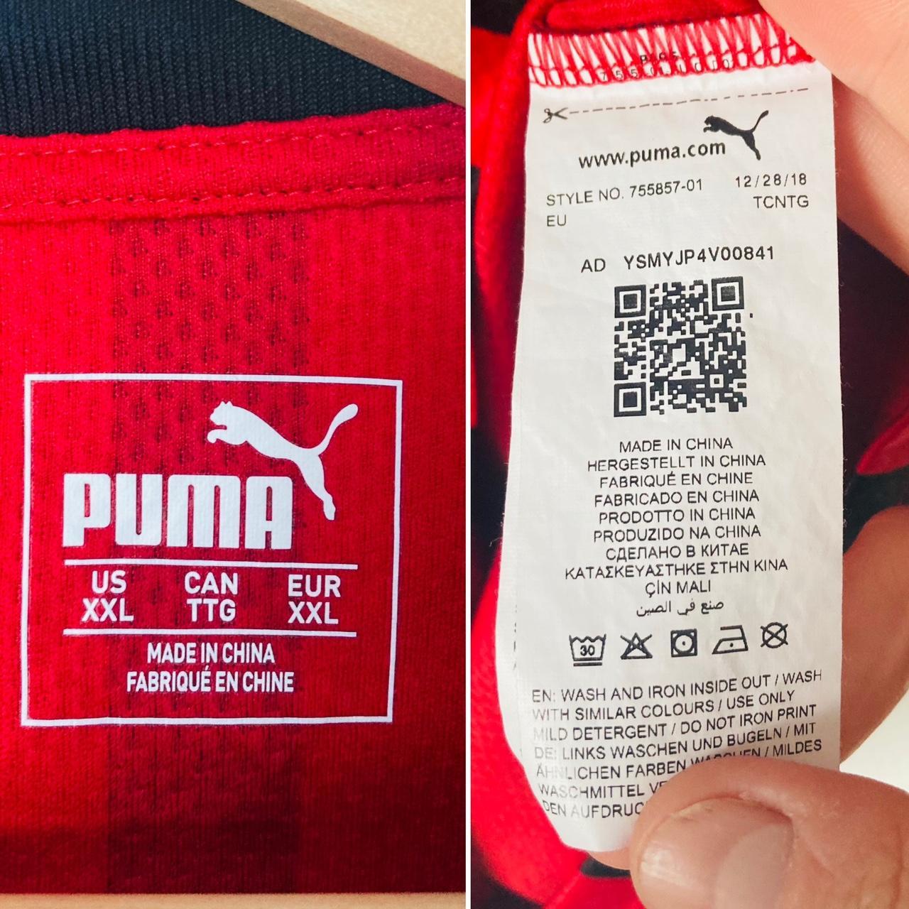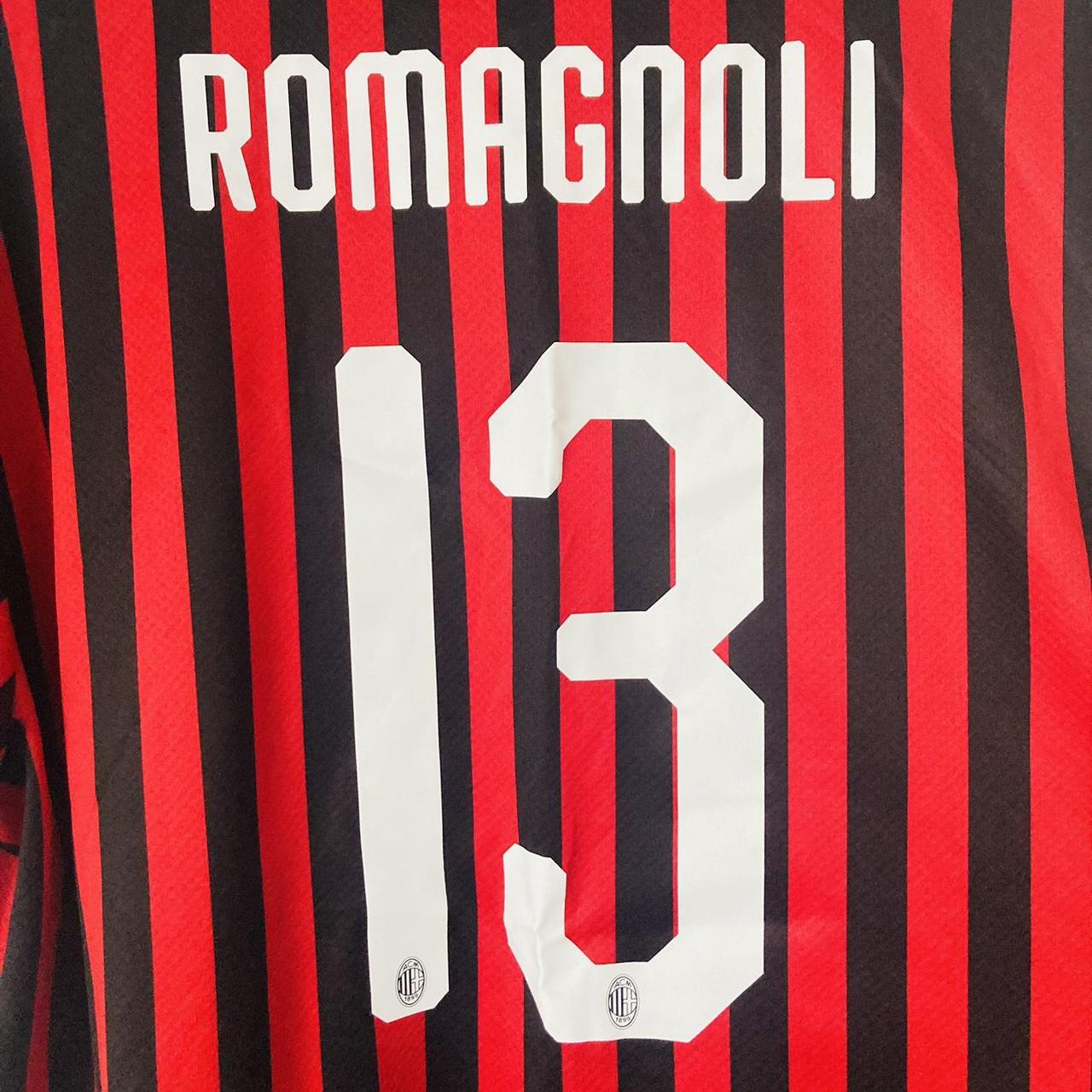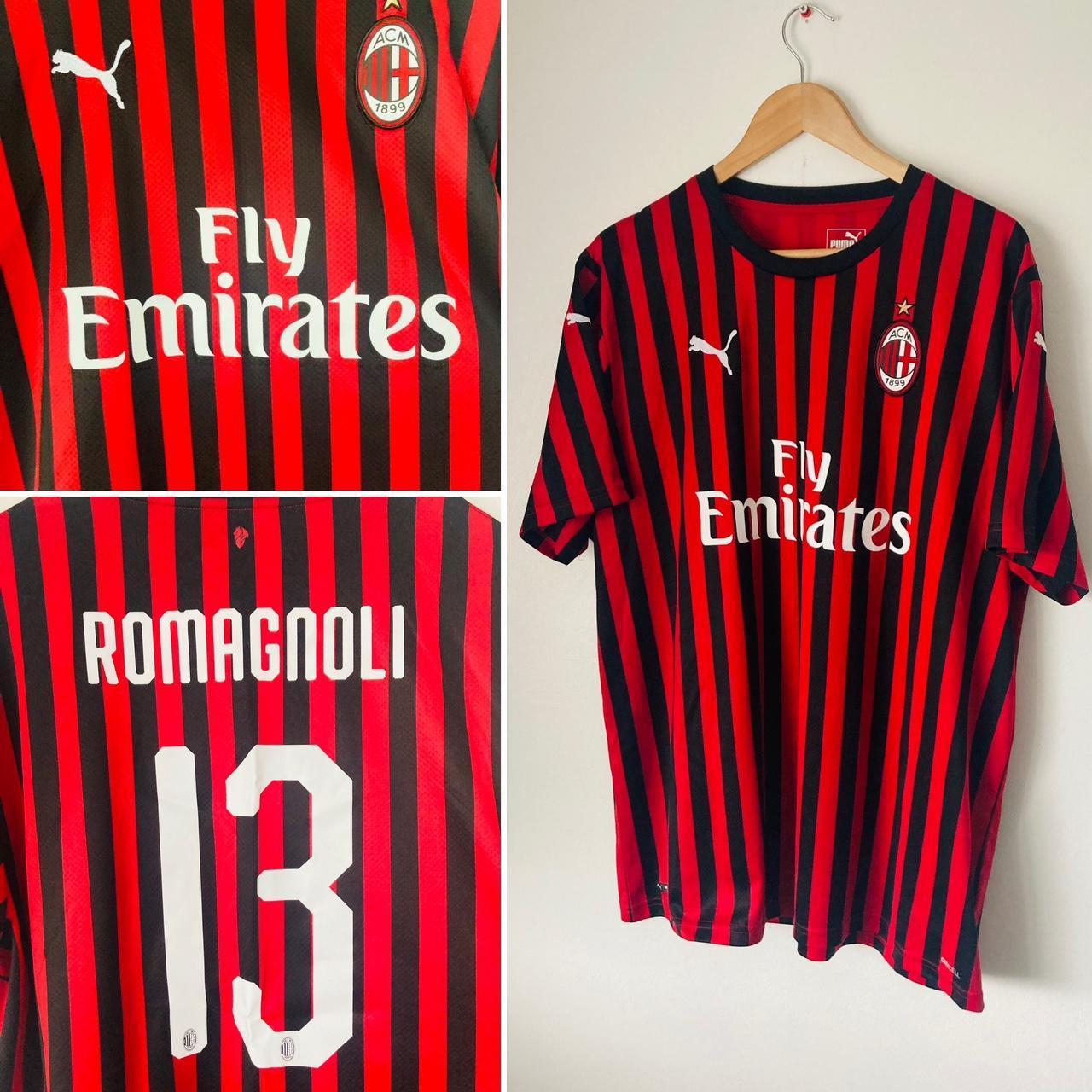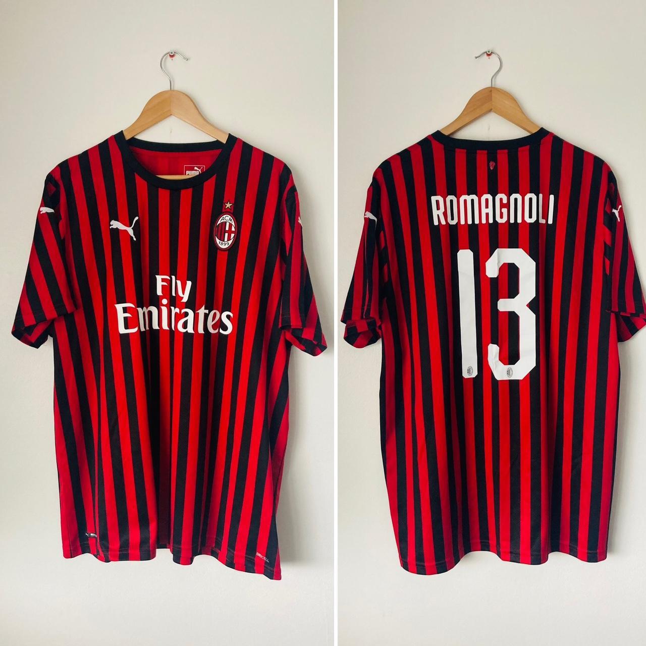 This iconic, vintage AC Milan home football shirt, season 2019/20, is an official piece in size adult XXL. It measures 24.5" in pit-to-pit chest and 30" in length, and is in pristine condition. The back features the official name and number of Alessio Romagnoli (13), as seen on Romagnoli during the season for Milan. Created by Puma in 2019 with the authenticity code 755857 01, this original shirt exudes passion and inspiration for any true fan of the team.