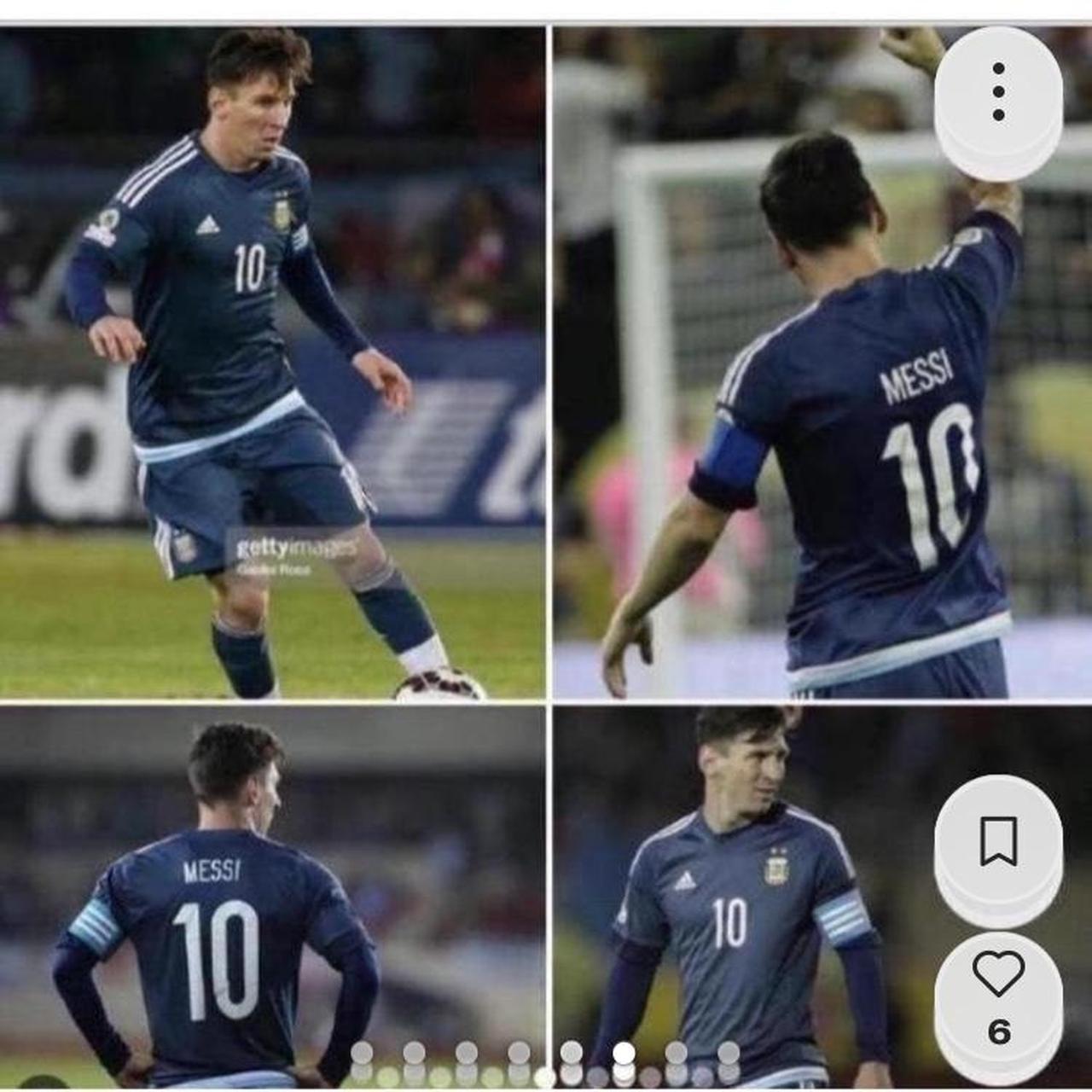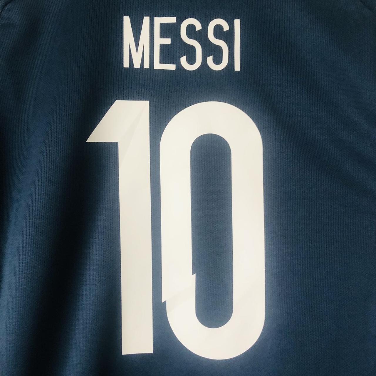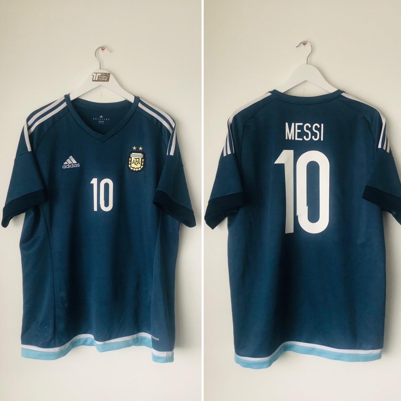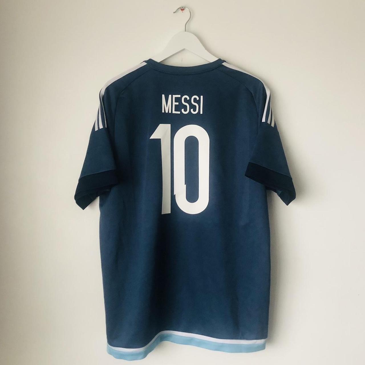 This Argentina away football shirt, featuring Lionel Messi's number 10, is available for purchase. It is an adult size XL and measures 23 inches in chest pit to pit and 29.5 inches in length. Manufactured by Adidas, it is in excellent condition and has a product code of M62629.