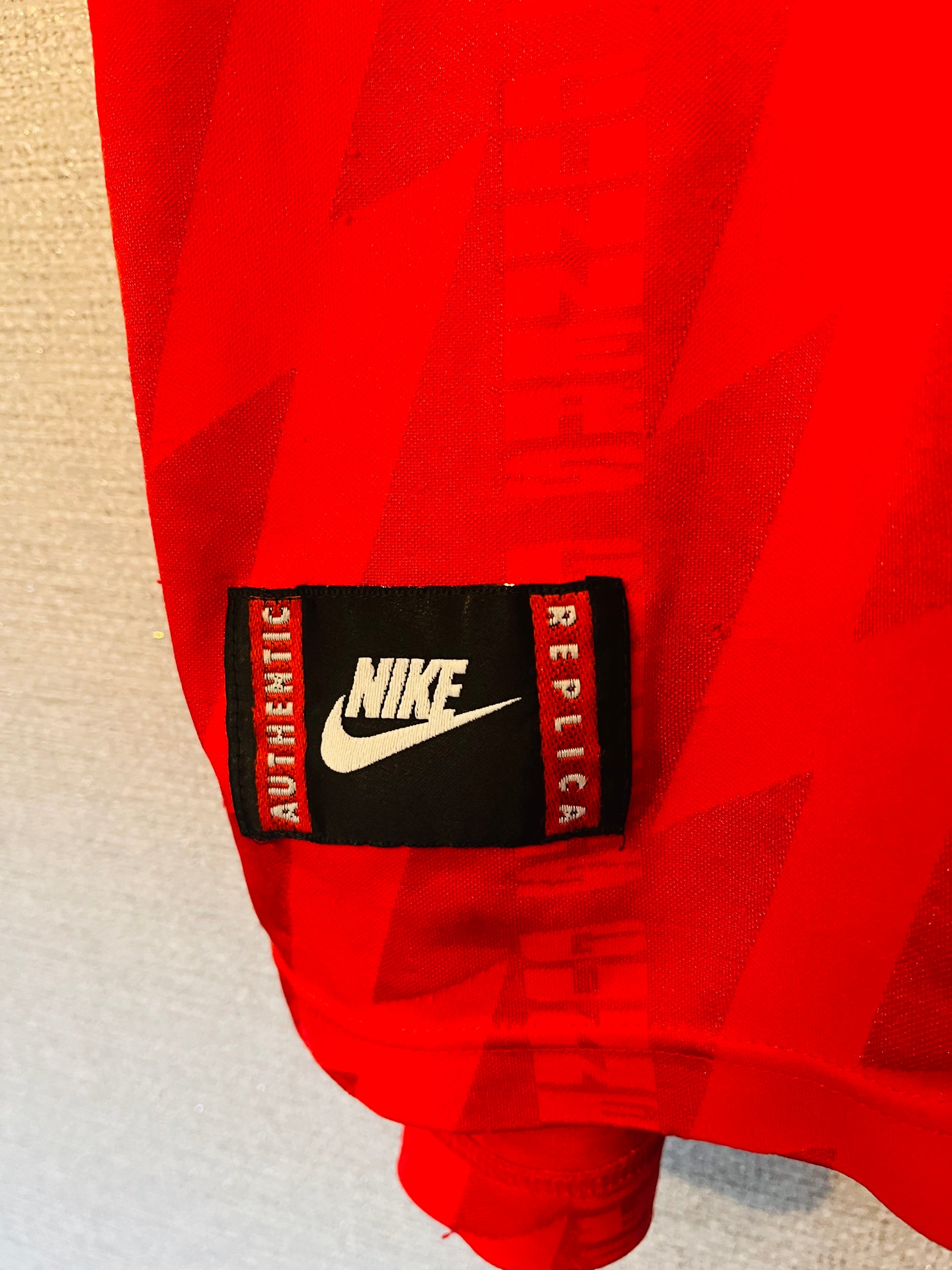 This shirt has seen some wear but is still in good condition. There may be some minor flaws such as light fading, small pulls, or faint stains, but these do not detract from the overall appearance or wearability of the shirt. A great choice for those looking to own a piece of football history at an accessible price.