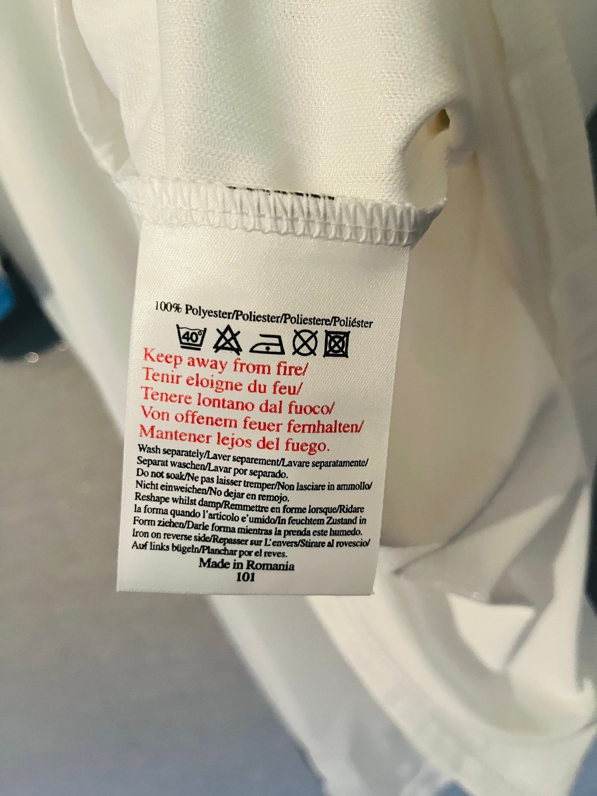 If ironing is necessary, turn the shirt inside out and use a cool setting. Never iron directly over printed areas or badges, as this can cause them to melt or peel.