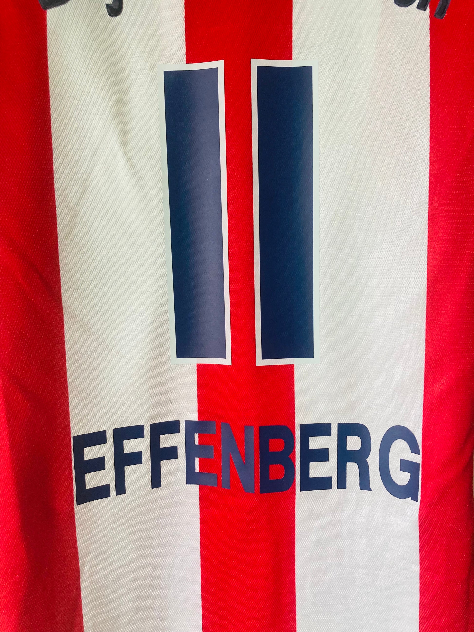 This shirt has seen some wear but is still in good condition. There may be some minor flaws such as light fading, small pulls, or faint stains, but these do not detract from the overall appearance or wearability of the shirt. A great choice for those looking to own a piece of football history at an accessible price.