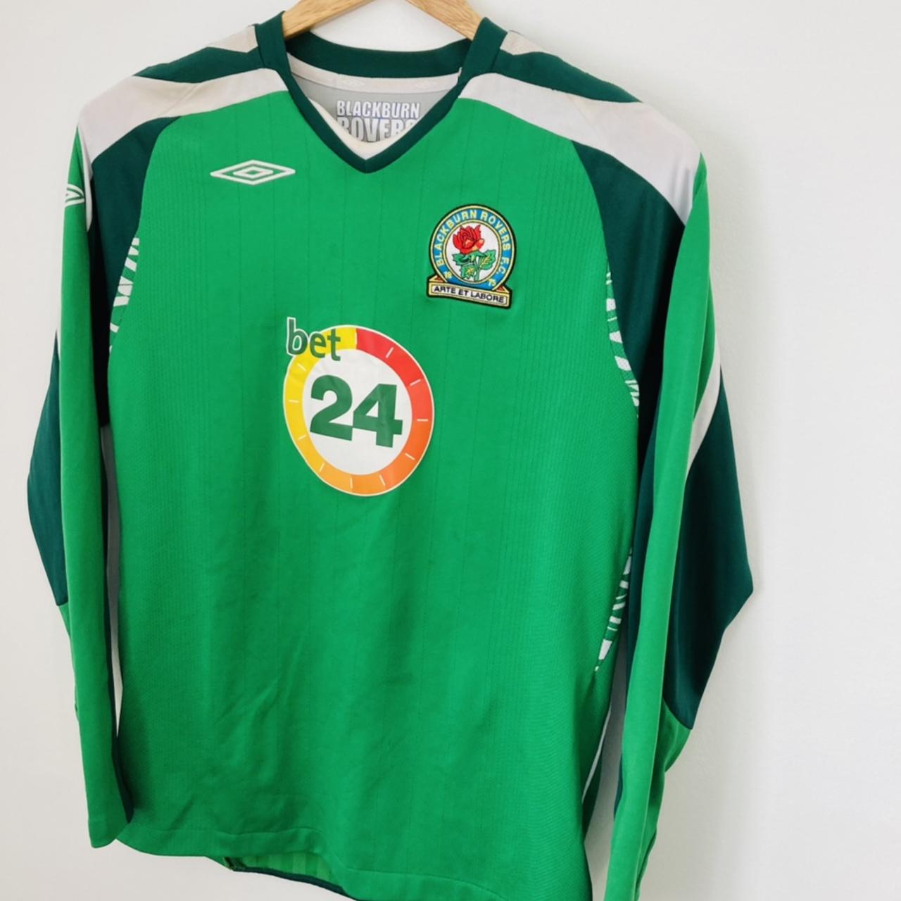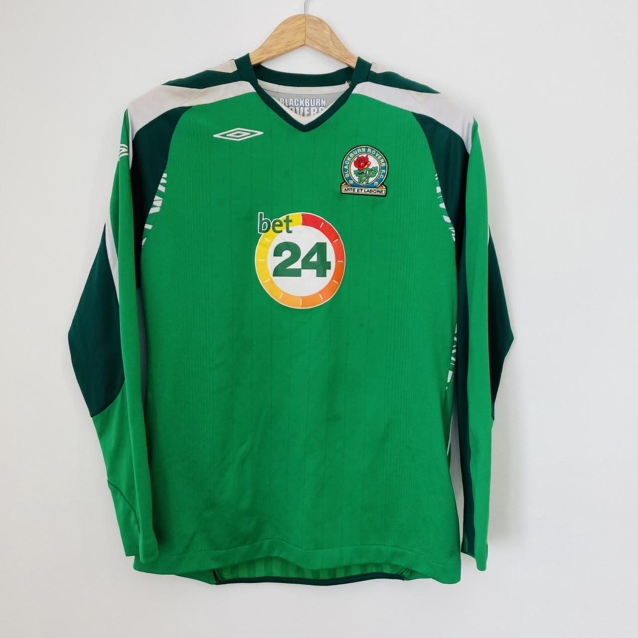 This youth XL Blackburn Rovers Goalkeeper football shirt from the 2007/2008 season is in excellent condition, with actual measurements of 18" chest and 26" length. Its size is comparable to an adult small and features long sleeves.