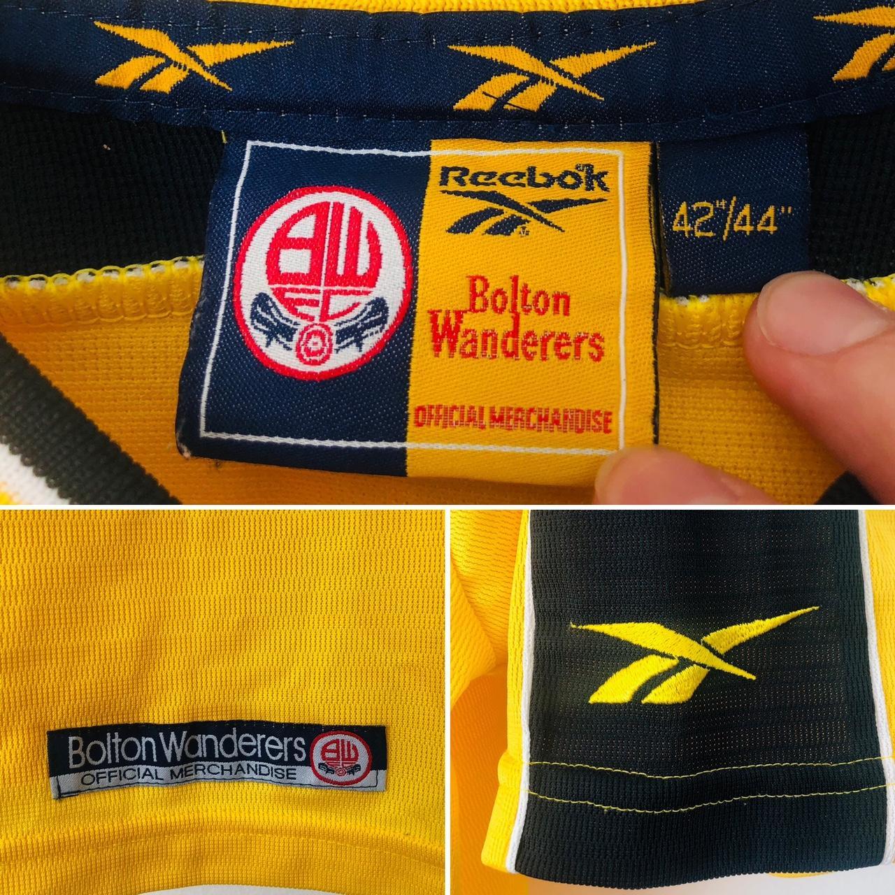 This vintage, official Bolton Wanderers away football shirt from the 1998/2000 season is now available for purchase. Sized as an adult large 42/44”, it measures chest pit to pit at 23.5” and has a length of 28”. With its typical 90s baggy fit, it could also work as an XL. The shirt is in excellent condition, making it a rare find for any collector. During these seasons, BWFC was on a charge under Sam Allardyce and eventually gained promotion, leading to their return to the top flight after a win in the play off final at Cardiff against Preston (while Wembley was undergoing renovations). For any further questions, please contact me. Worldwide shipping costs £12 and the item will be dispatched the same day or next day. Don't forget to follow my Instagram at topofthetops.football.shirts for more vintage and retro football shirts!