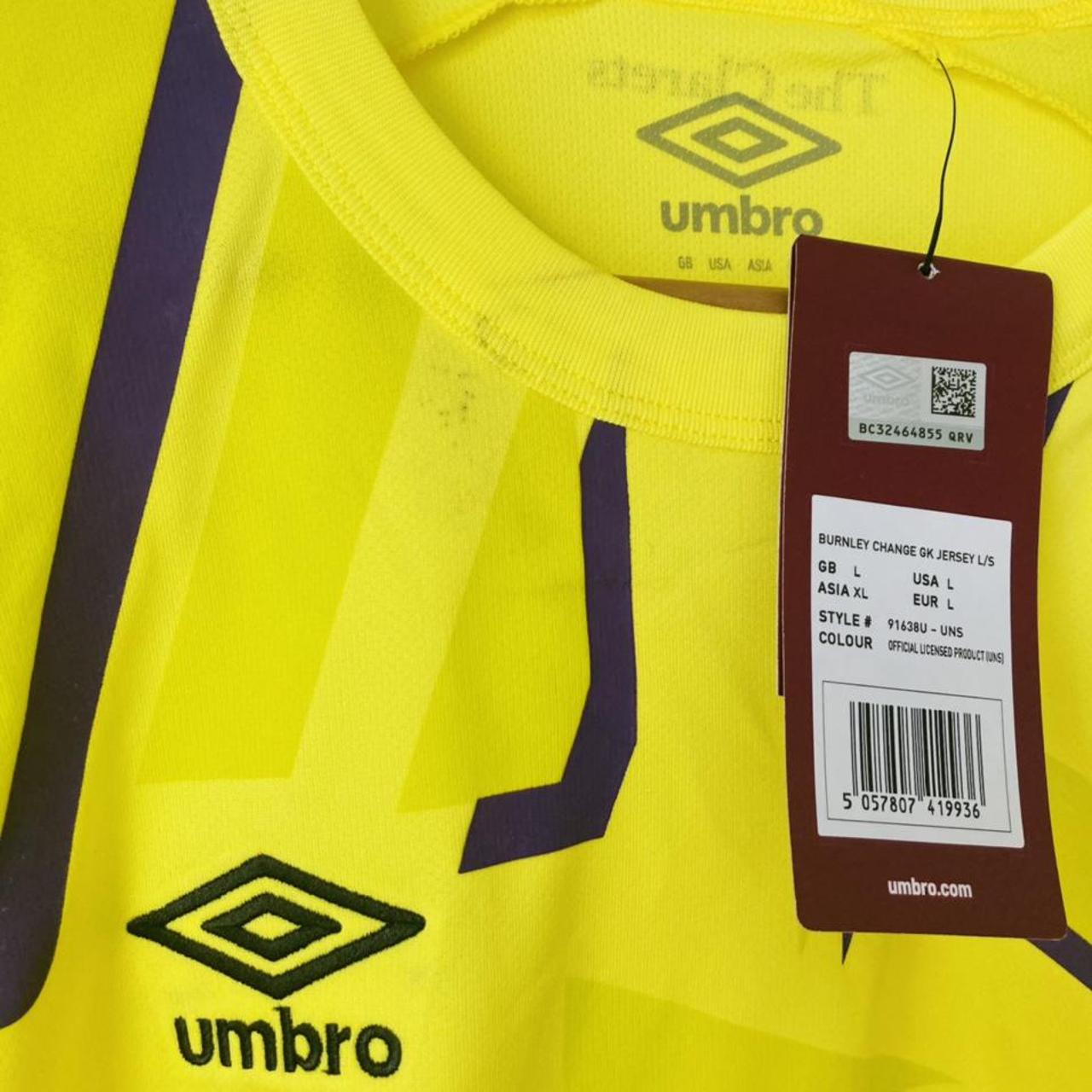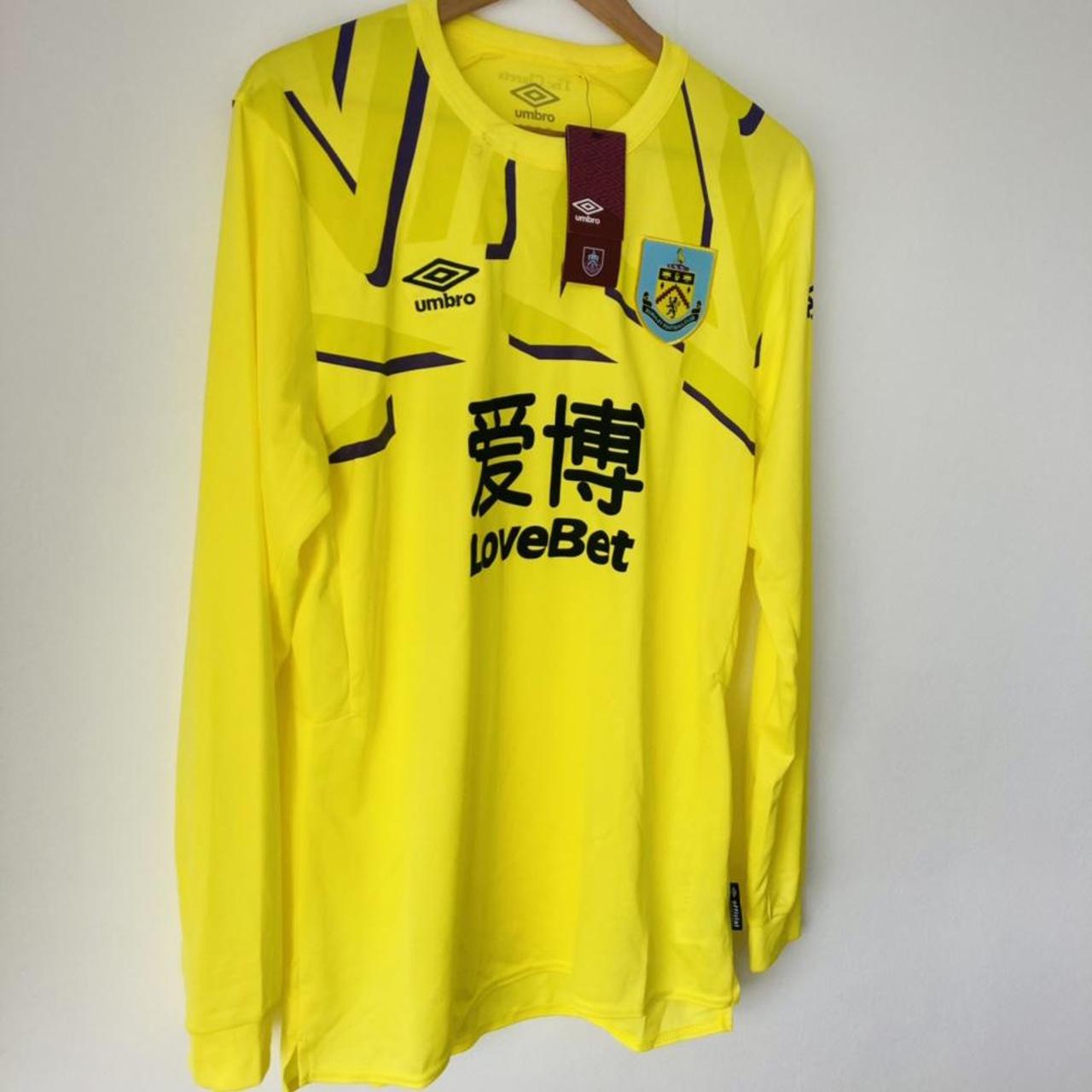 The Burnley 2019/2020 Yellow Goalkeeper Football Shirt (L) is an authentic, original football shirt for sale. It is a size adult large, with measurements of 21" chest and 29" length. Despite being brand new with tags, there is a small storage stain on the collar (see last photo), but the shirt is still in excellent condition with long sleeves.