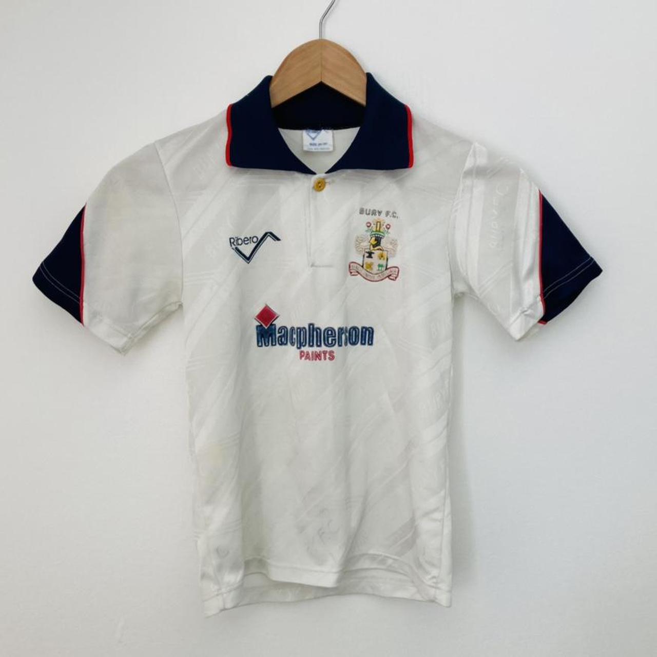 This rare, vintage Bury home football shirt from the 1990/91 season is original and available for purchase in size 26/28. The label states chest measurement of 14 inches and length of 20 inches. It is in excellent condition and would be ideal for a football shirt collector or for framing, or even for a child who is a Bury fan.