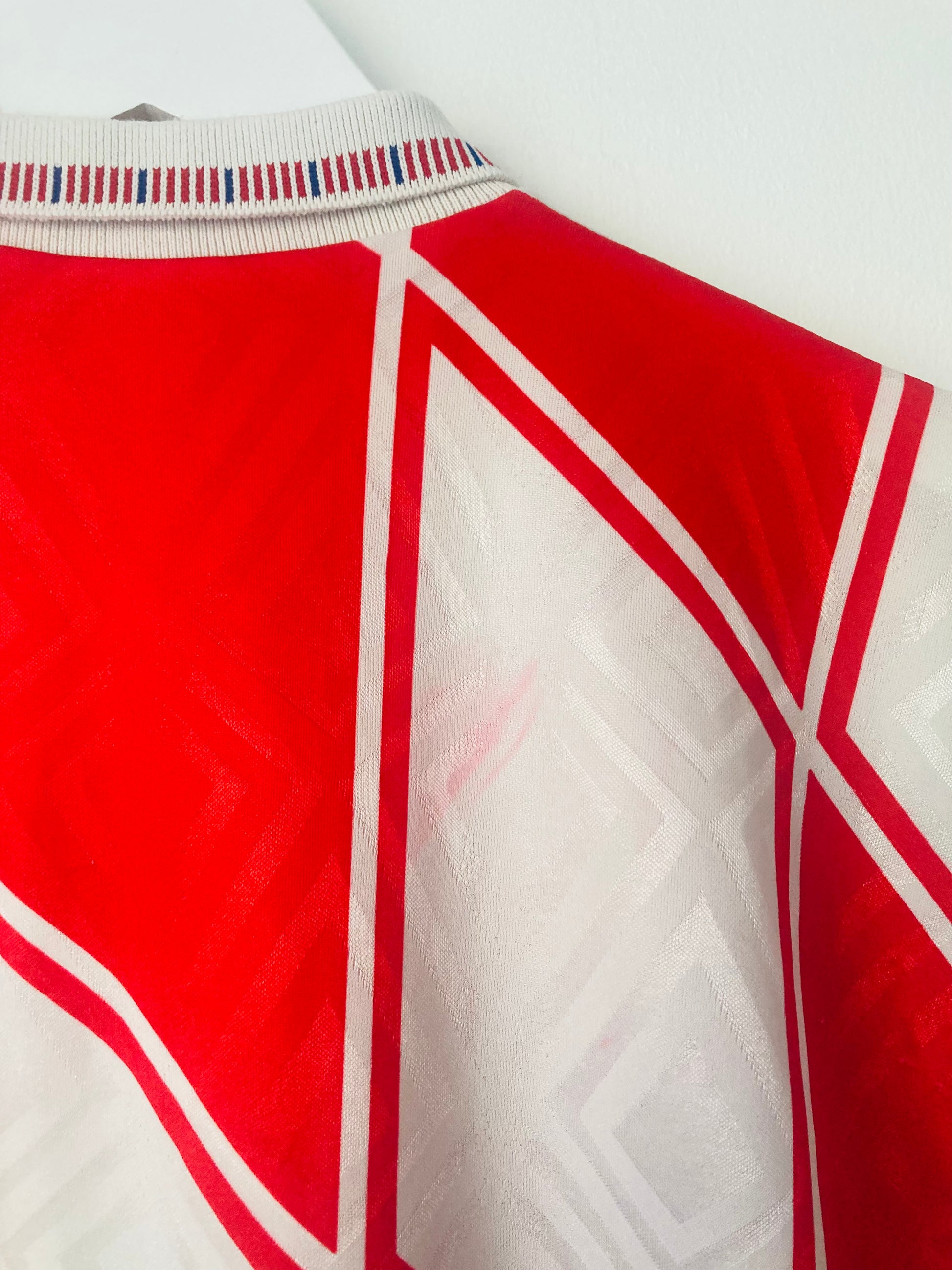 This shirt has seen some wear but is still in good condition. There may be some minor flaws such as light fading, small pulls, or faint stains, but these do not detract from the overall appearance or wearability of the shirt. A great choice for those looking to own a piece of football history at an accessible price.