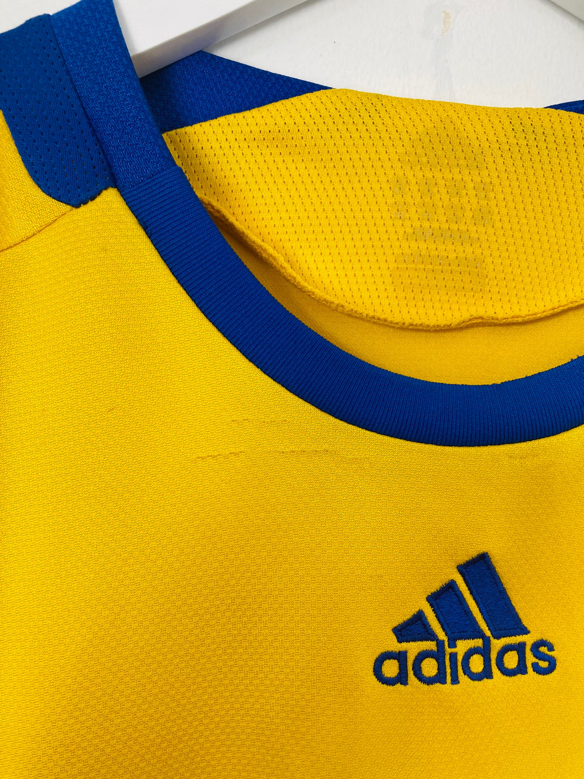 This shirt has seen some wear but is still in good condition. There may be some minor flaws such as light fading, small pulls, or faint stains, but these do not detract from the overall appearance or wearability of the shirt. A great choice for those looking to own a piece of football history at an accessible price.