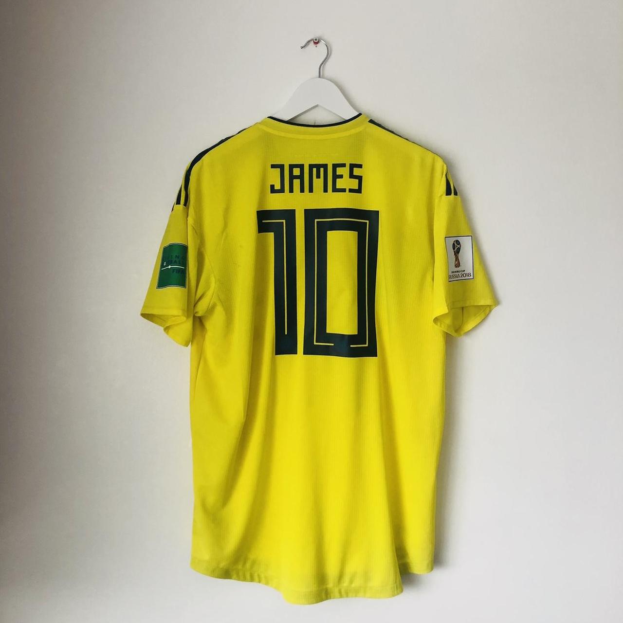 Authentic & genuine - 2018 Columbia home football shirt in size XL for sale. This shirt features player James Rodriguez's number 10 and is from the World Cup season. Measurements include 23" pit to pit chest and 31" in length. Manufactured by Adidas, the shirt is in very good condition with a plastic layer over the logo that cannot be removed and one or two minor marks. Product code BR3512 is the correct code for the player version and includes all authenticity labels, printed size label, World Cup 2018 arm patches, and printed adidas logo & arm stripes (not embroidered). Shirts are authentic & genuine from the year they were released.