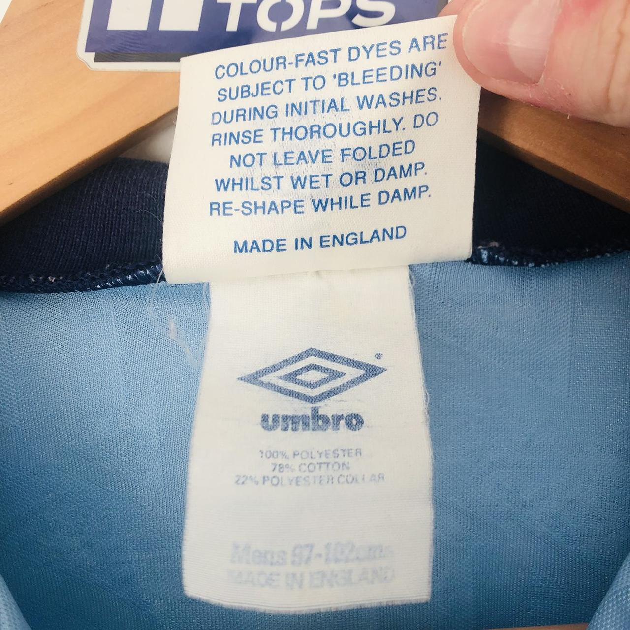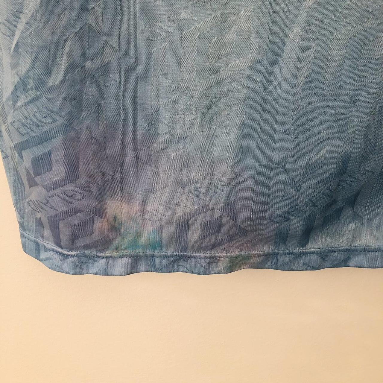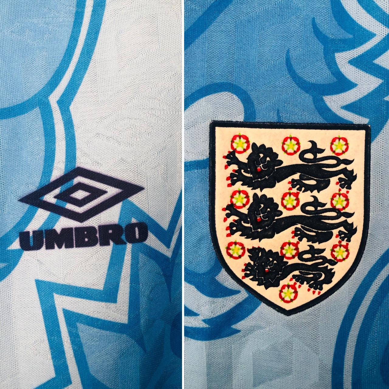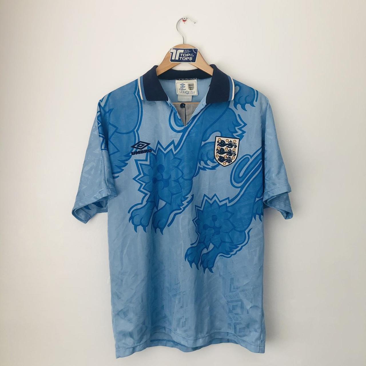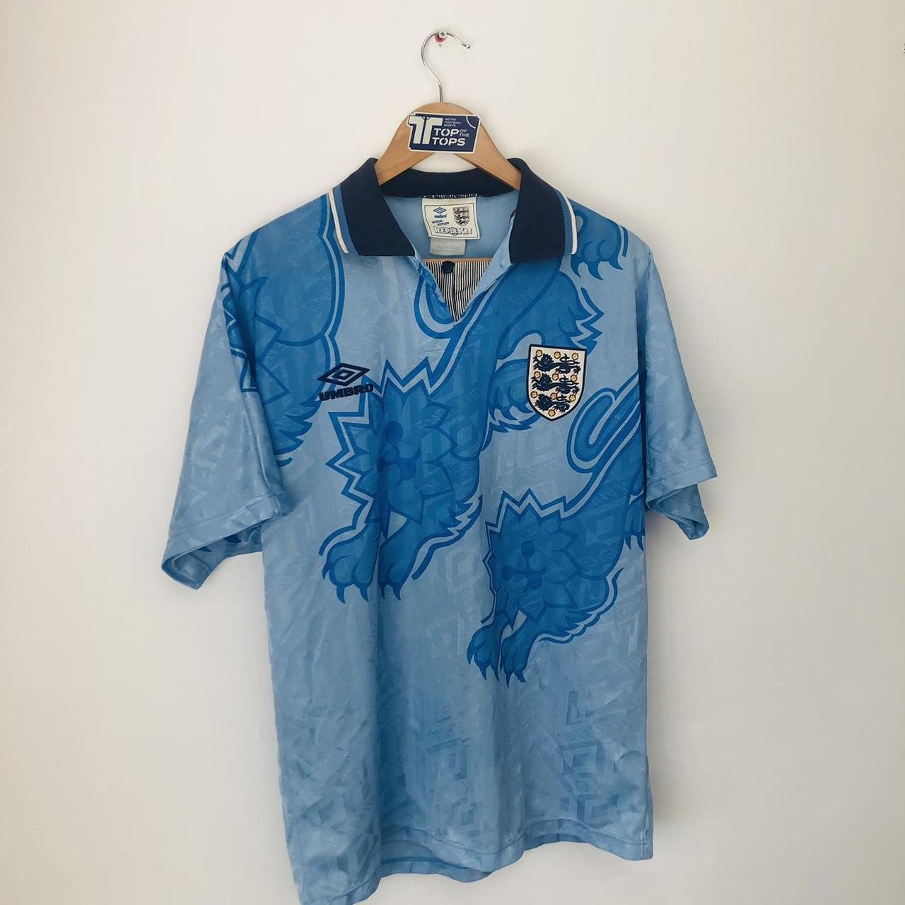 Get your hands on a piece of football history! This England 1992 Blue Football Shirt (L) is a classic, authentic piece from Umbro. It features the iconic third team design and measures at adult Large. With excellent condition and limited color wear, it's the perfect addition to any sport fan's collection. Stay updated on our latest releases by following us on Instagram @topofthetops_uk.