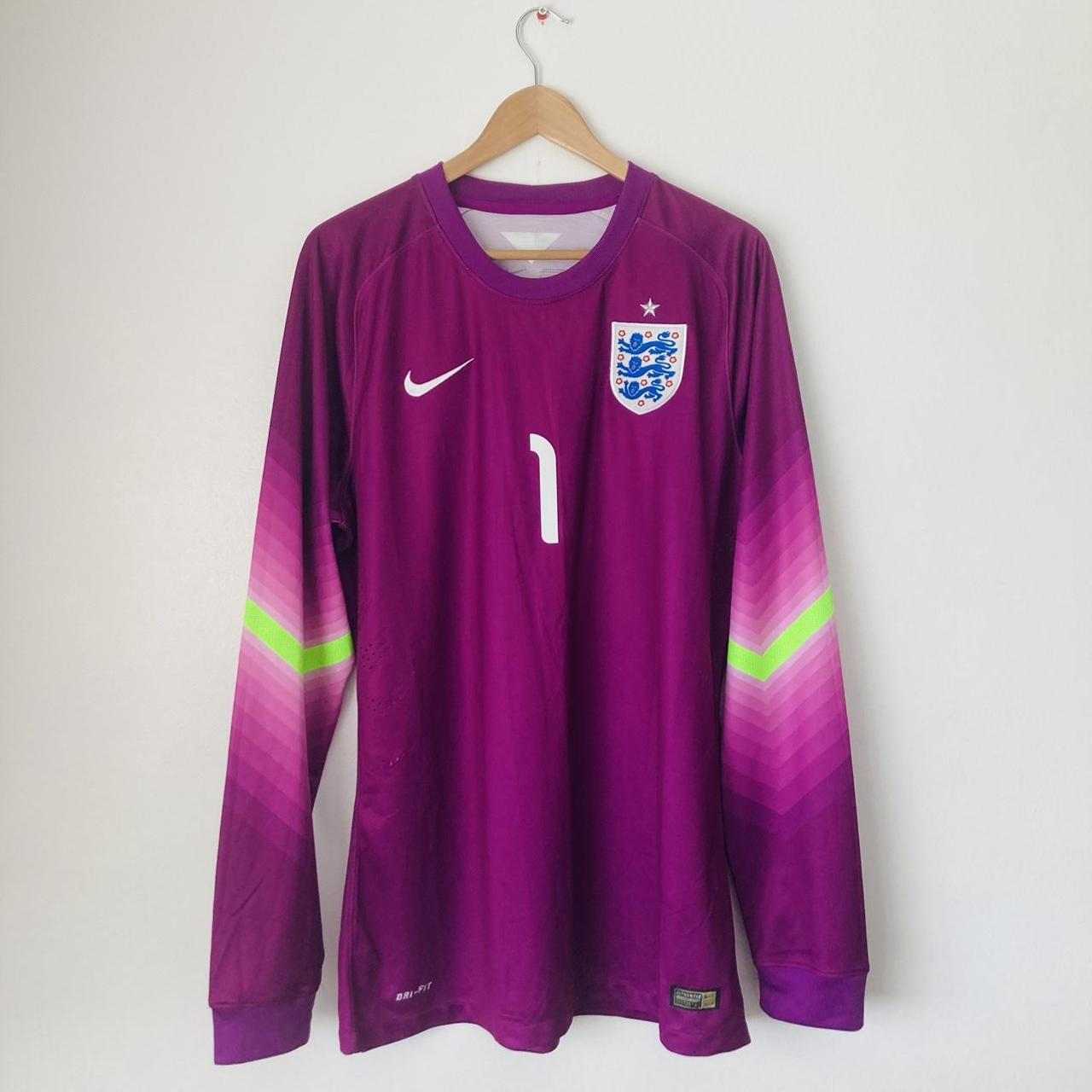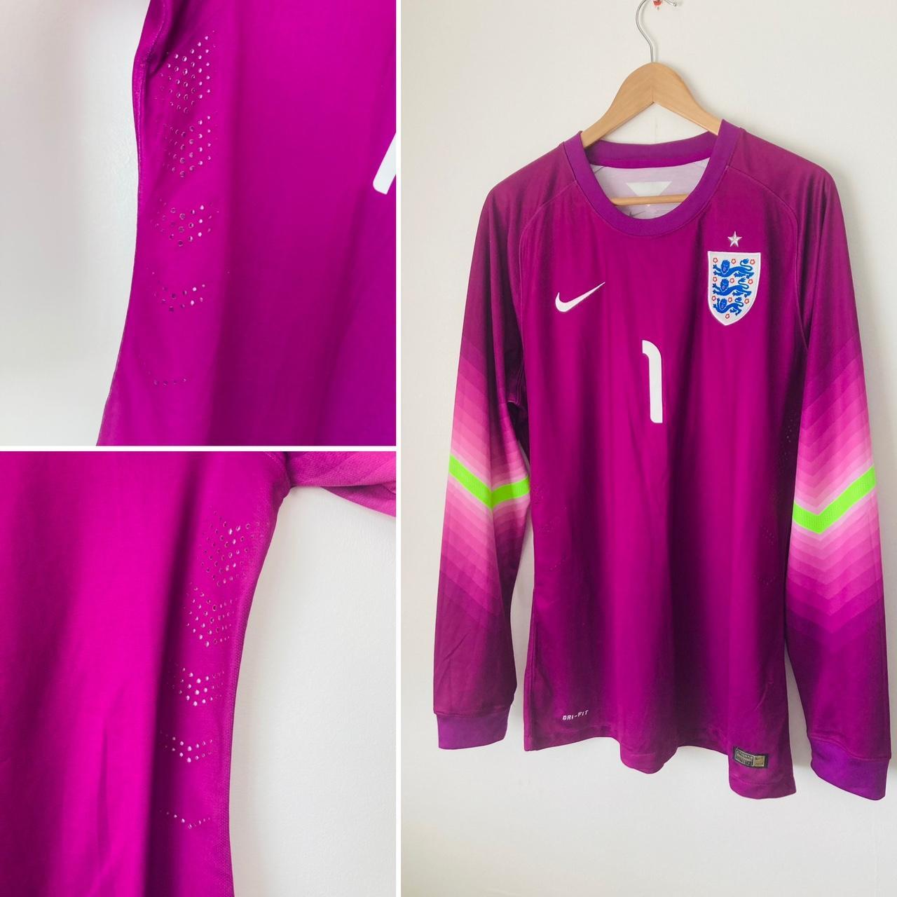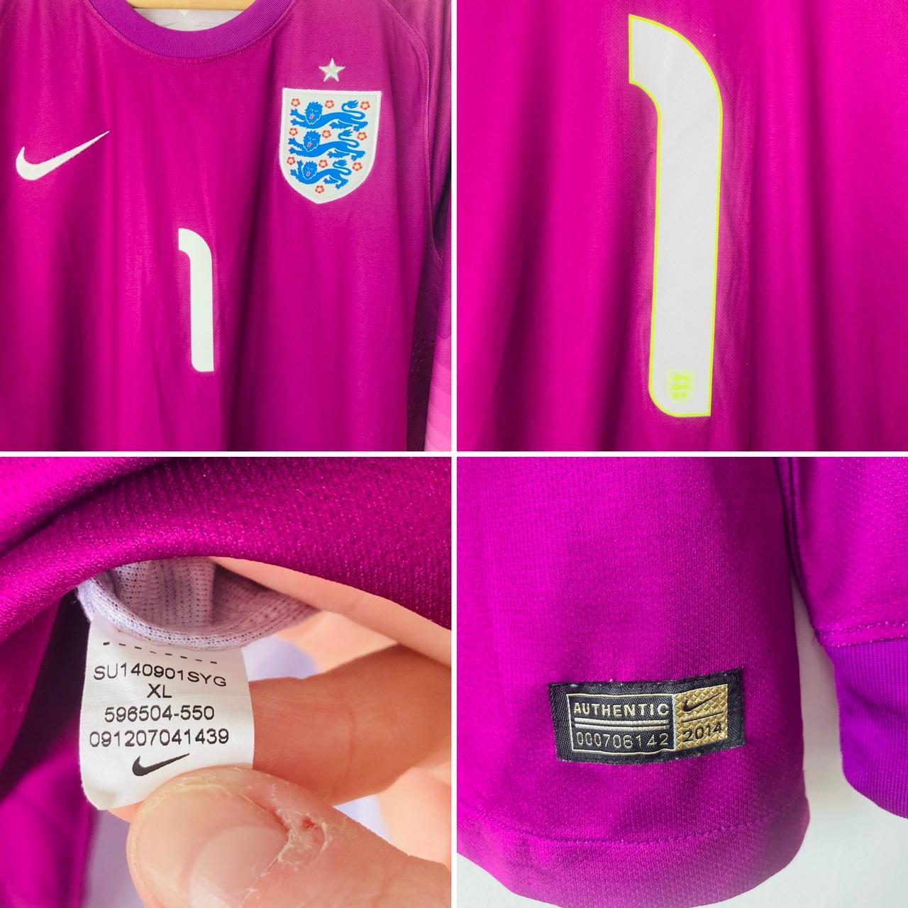 This England Goalkeeper football shirt from the 2014/15 season is a rare player issue in size adult XL, measuring 22.5" pit to pit, 31" in length, and with sleeve length at 33.5". Minor bobbles are present but the shirt is in excellent condition. Unique player issue features include breathable side panel air holes and an officially printed inside wash label with an authenticity label only available to collectors. It makes for an ideal gift for those who collect player issued shirts.