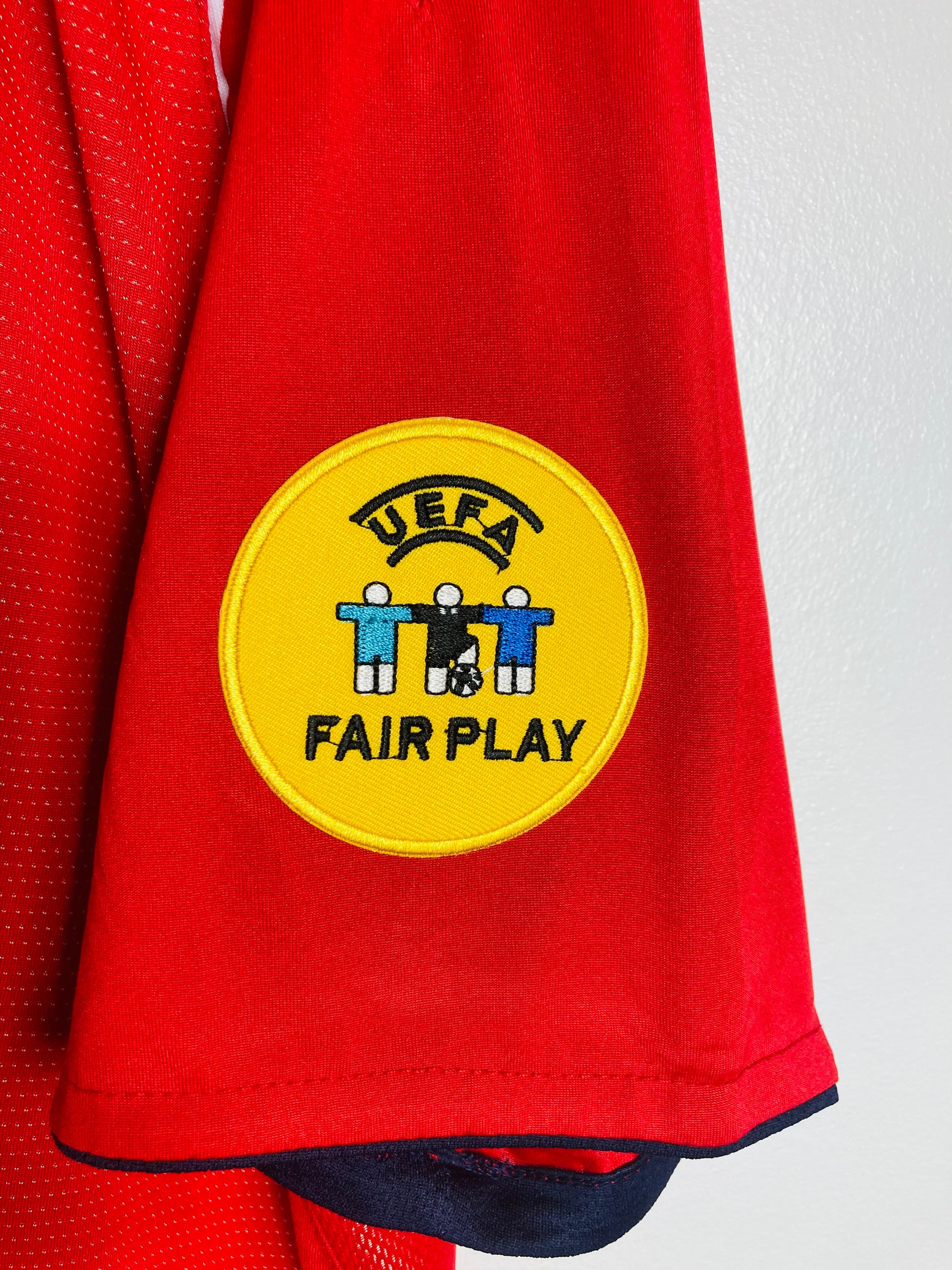 This shirt has seen some wear but is still in good condition. There may be some minor flaws such as light fading, small pulls, or faint stains, but these do not detract from the overall appearance or wearability of the shirt. A great choice for those looking to own a piece of football history at an accessible price.