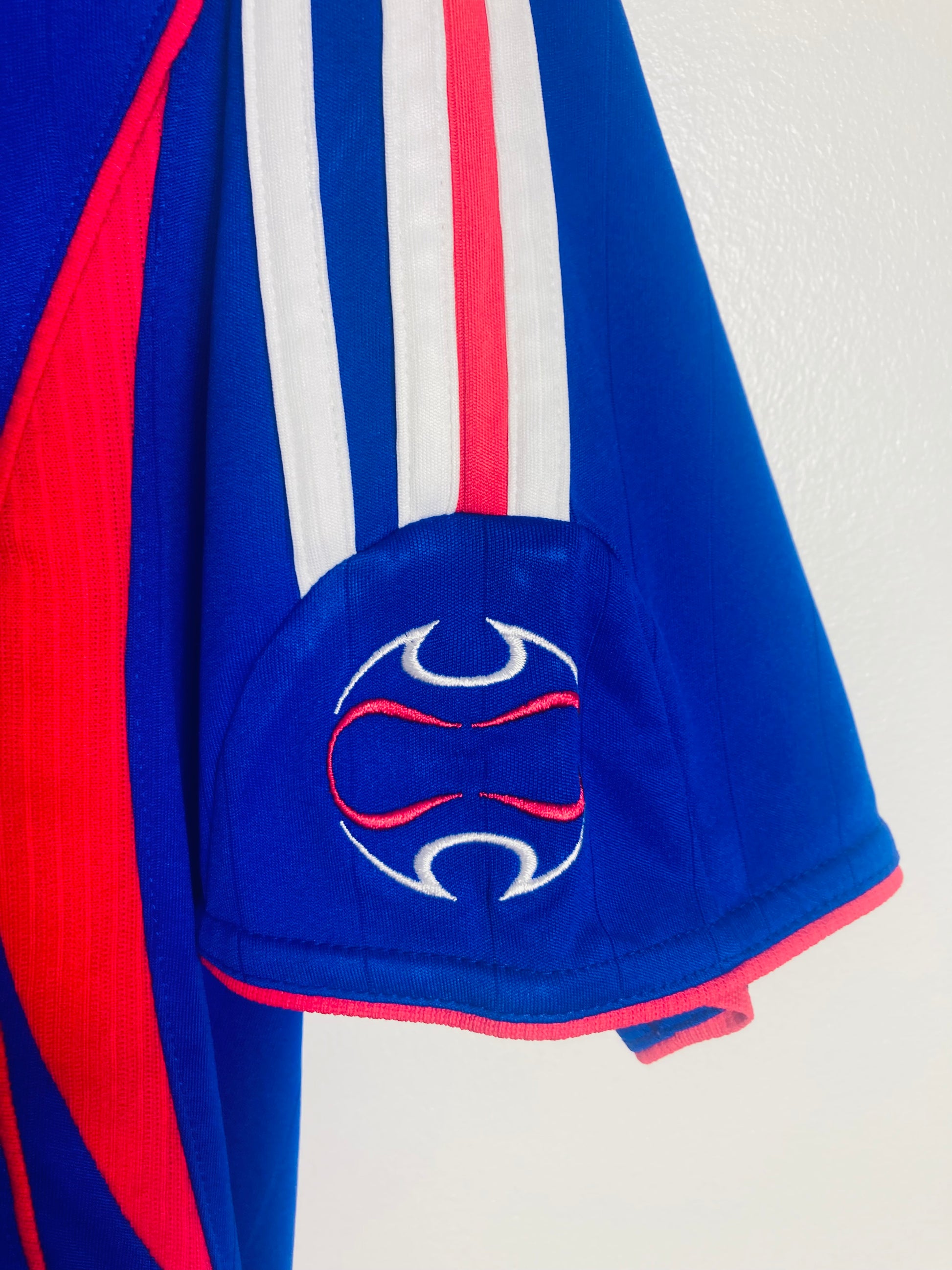 This shirt has seen some wear but is still in good condition. There may be some minor flaws such as light fading, small pulls, or faint stains, but these do not detract from the overall appearance or wearability of the shirt. A great choice for those looking to own a piece of football history at an accessible price.