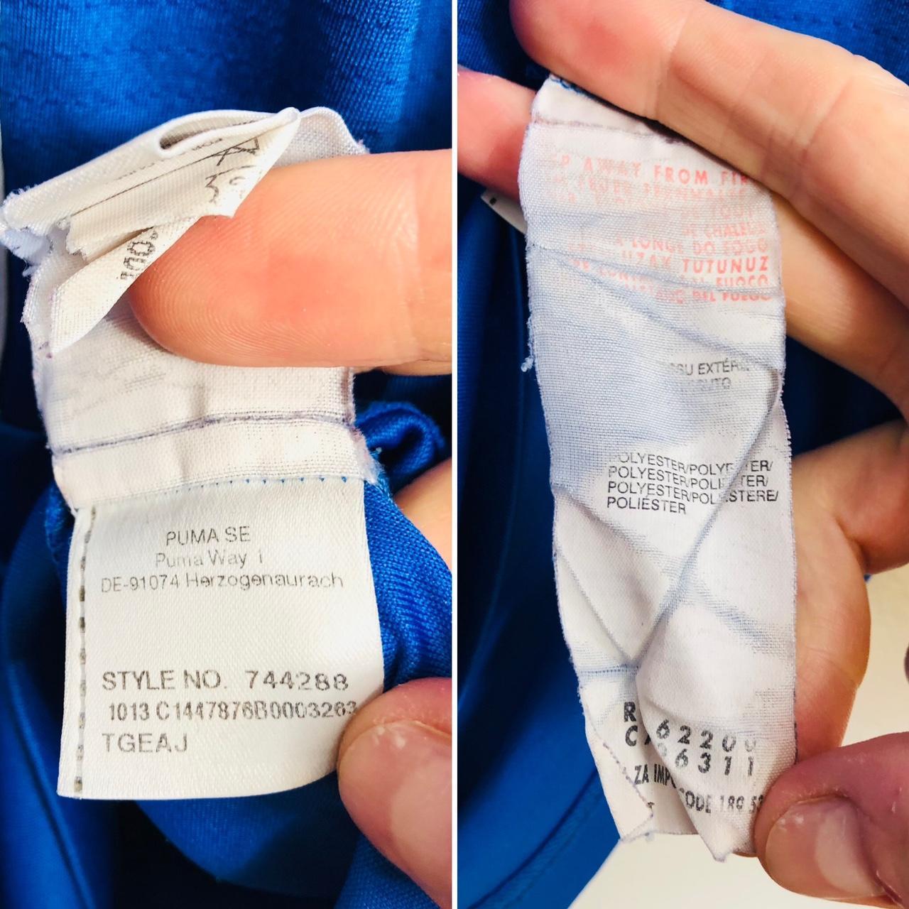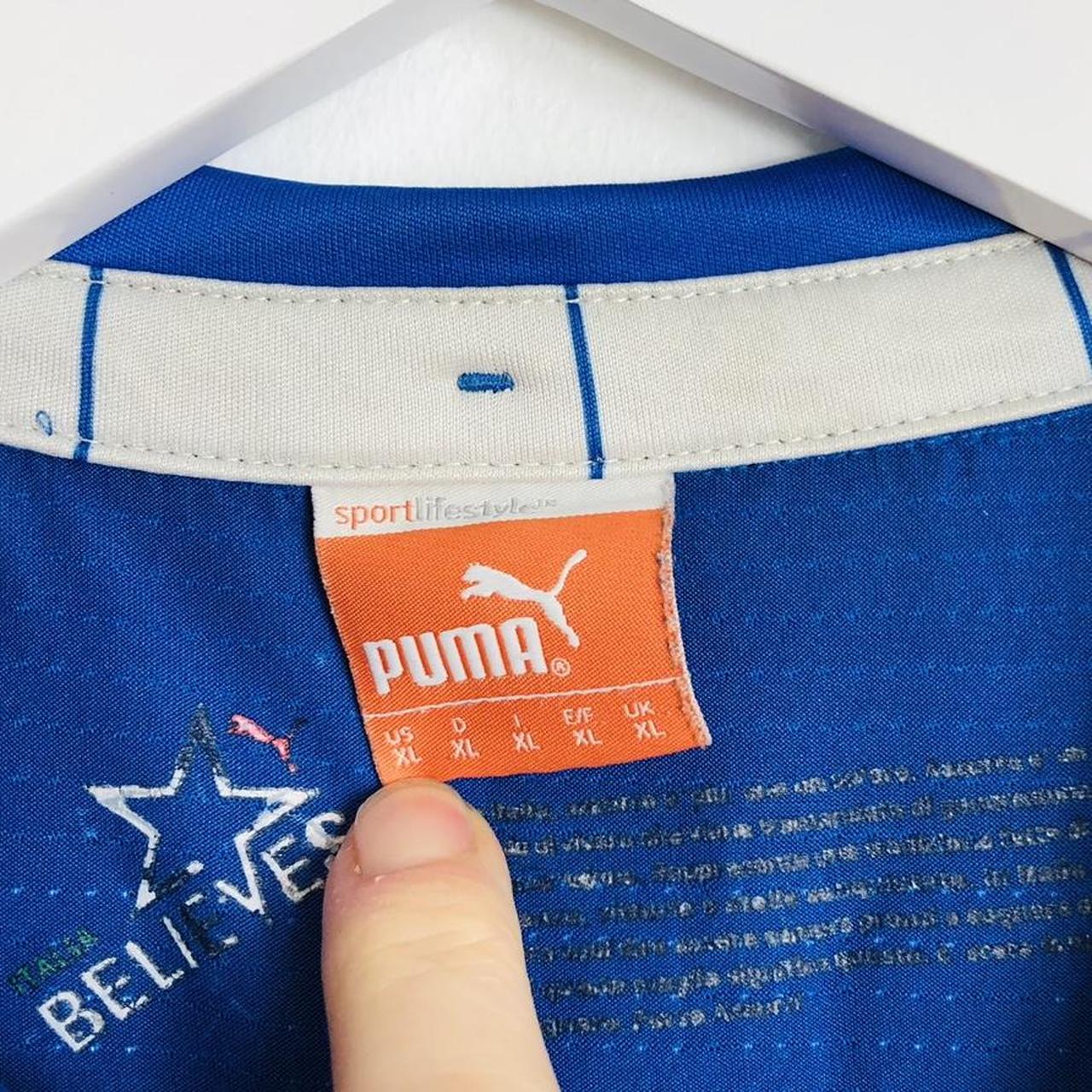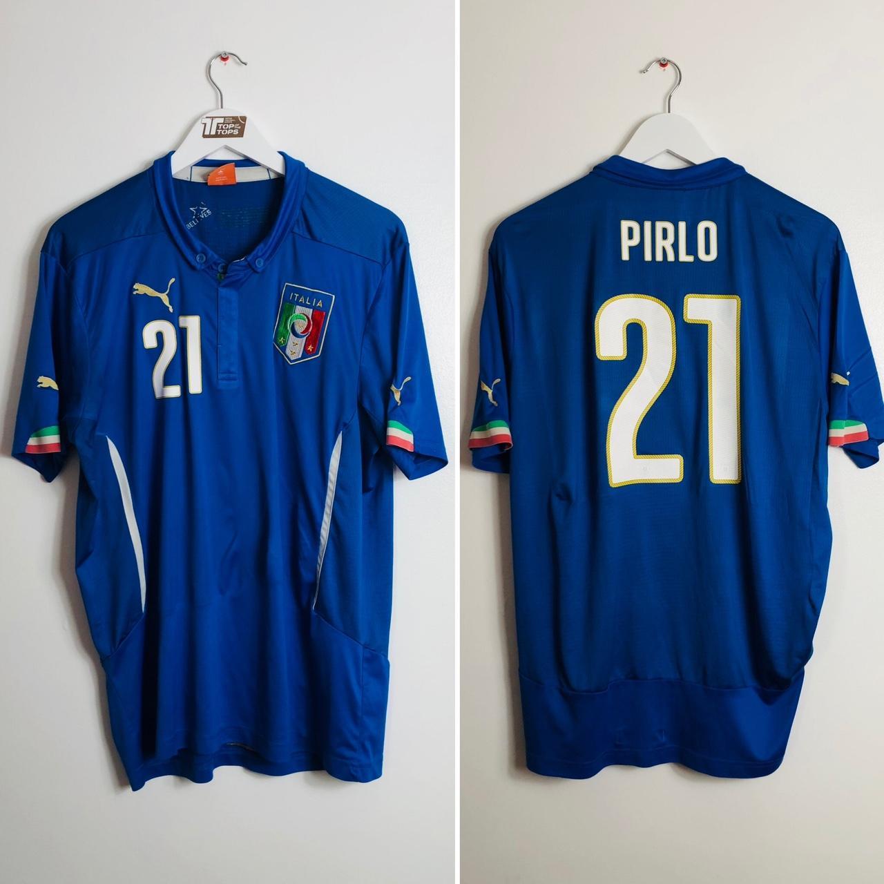 This authentic Italy home football shirt, featuring the renowned player Andrea Pirlo (21), is available for sale in adult XL size for the 2014/15 season. With a chest pit to pit measurement of 22.5" and a length of 29", it can be worn comfortably by those who typically wear a large or a fitted XL. The product is manufactured by Puma and is in very good condition with slight usage. All prints and badges remain in excellent condition. Product code: 744288.