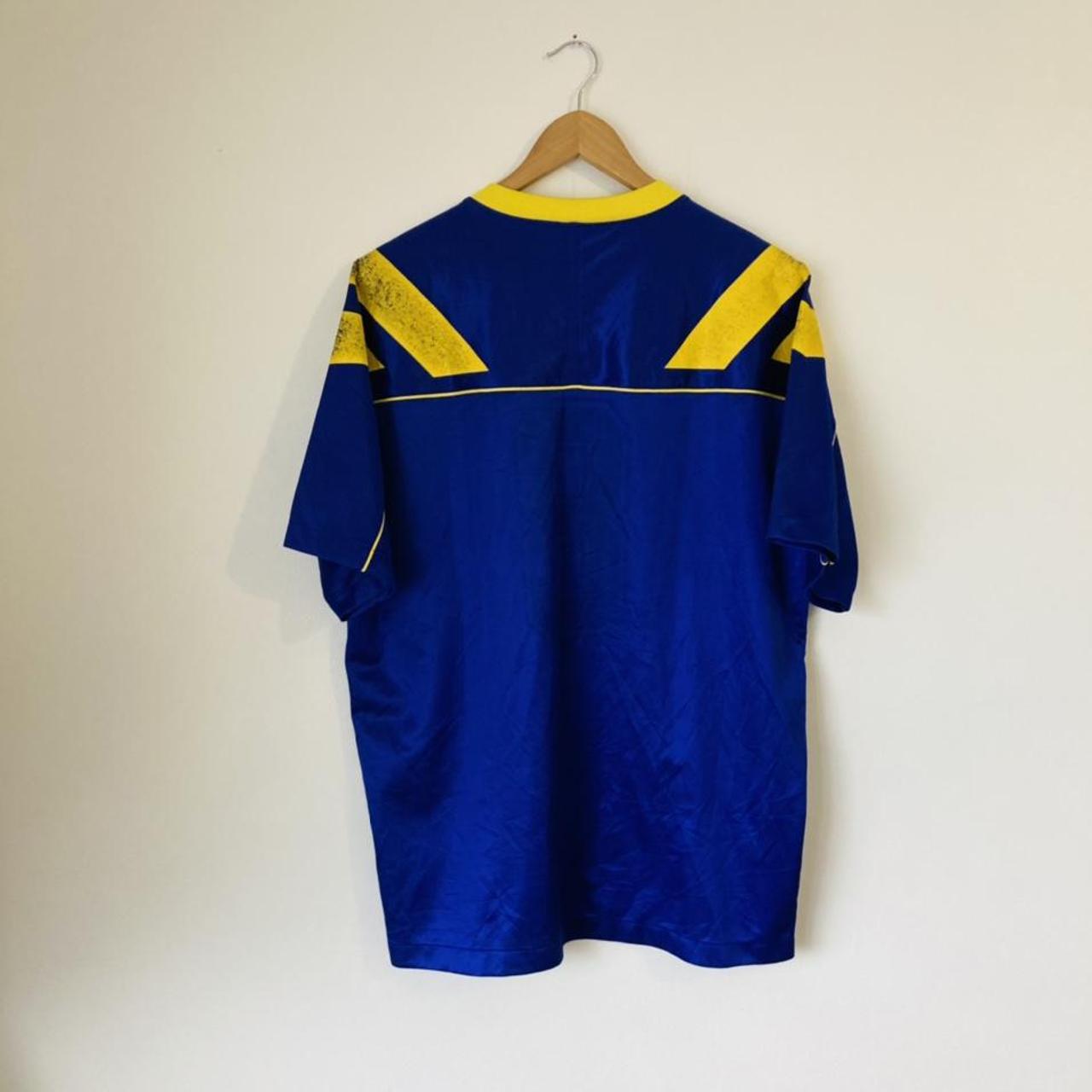 This shirt has seen some wear but is still in good condition. There may be some minor flaws such as light fading, small pulls, or faint stains, but these do not detract from the overall appearance or wearability of the shirt. A great choice for those looking to own a piece of football history at an accessible price.