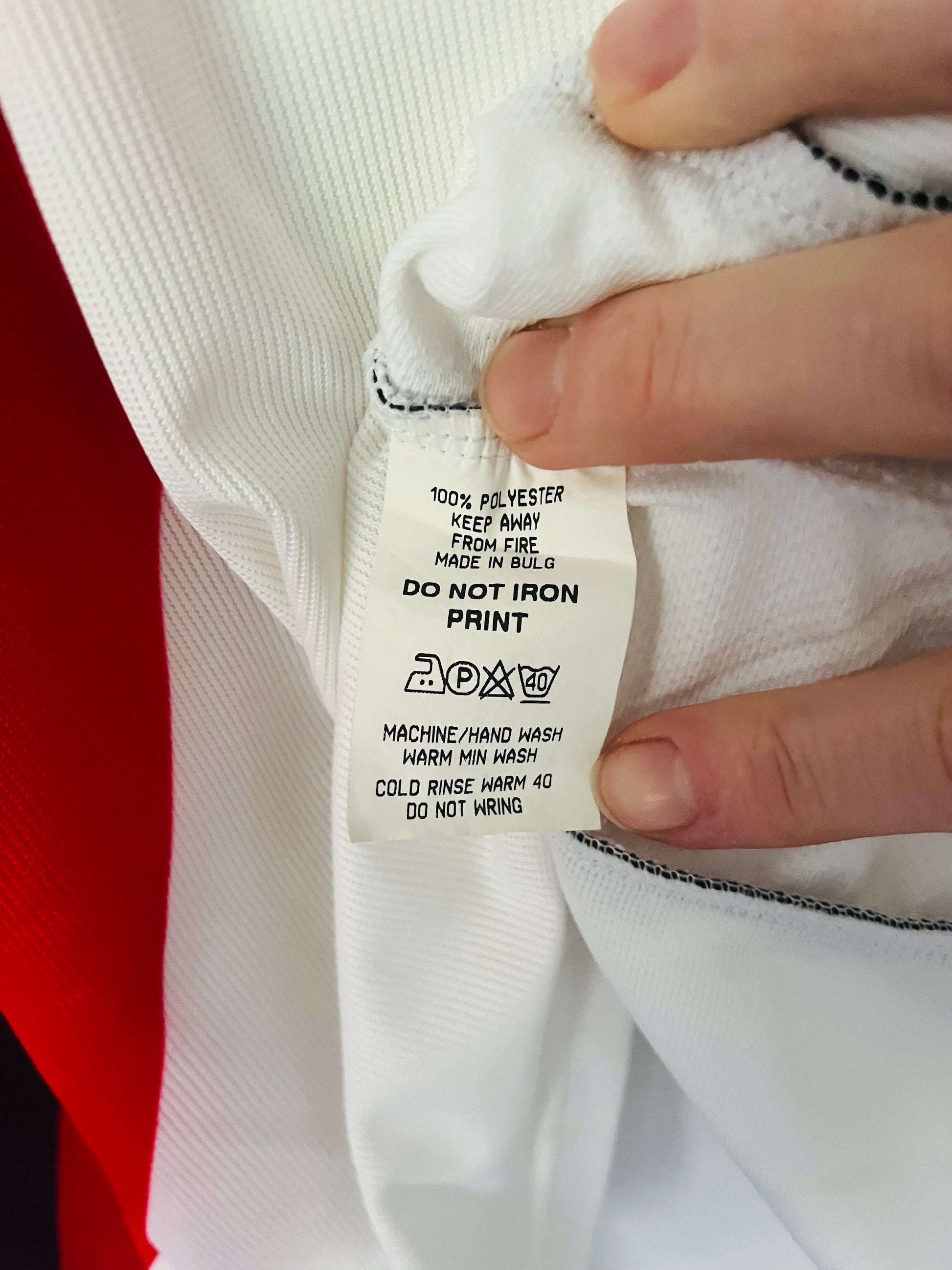 If ironing is necessary, turn the shirt inside out and use a cool setting. Never iron directly over printed areas or badges, as this can cause them to melt or peel.