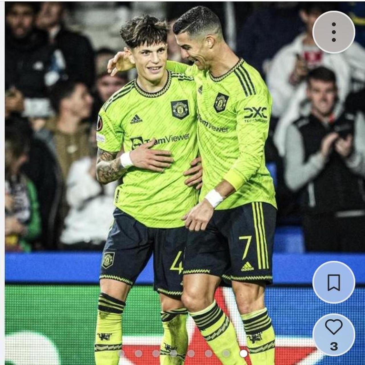This shirt is an official and genuine Manchester United third football shirt for the 2022/23 season. It is labeled as a size adult Medium, with a chest measurement of 20 inches and a length of 28 inches. The shirt is in excellent condition, with immaculate prints. It features Garnacho's official Premier League number 49 on the back, as worn by him during the season for Man Utd.