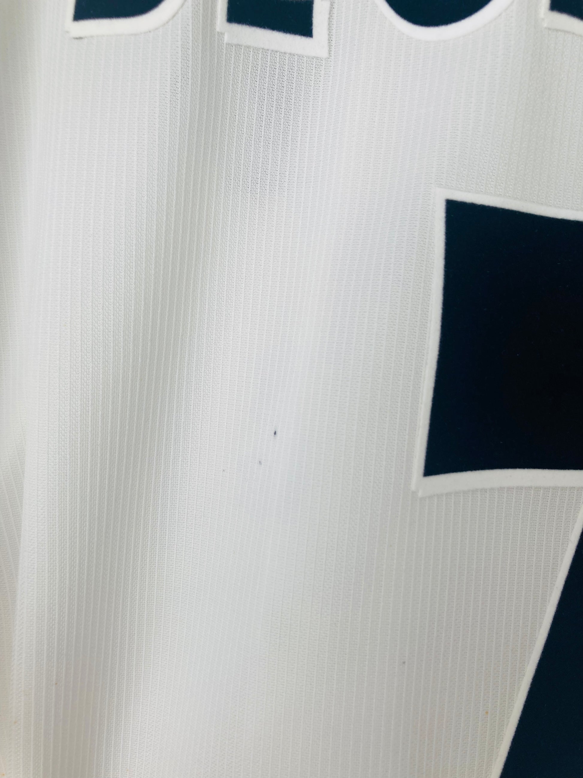 This shirt has seen some wear but is still in good condition. There may be some minor flaws such as light fading, small pulls, or faint stains, but these do not detract from the overall appearance or wearability of the shirt. A great choice for those looking to own a piece of football history at an accessible price.