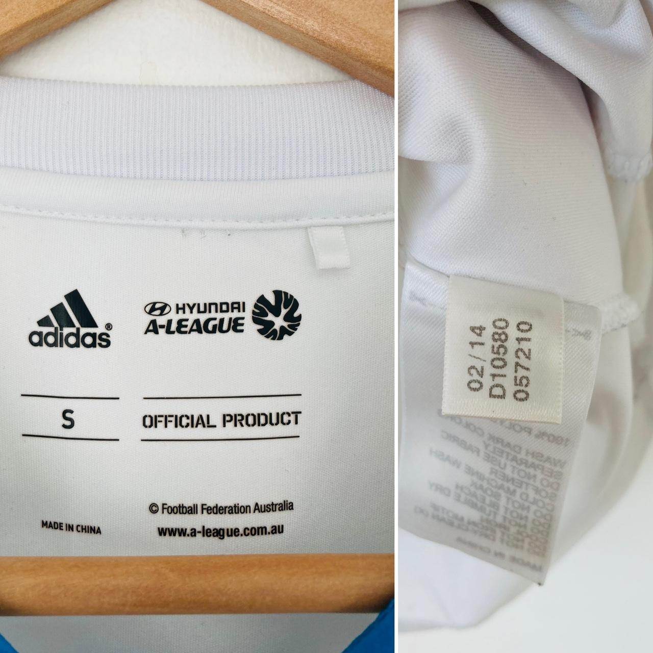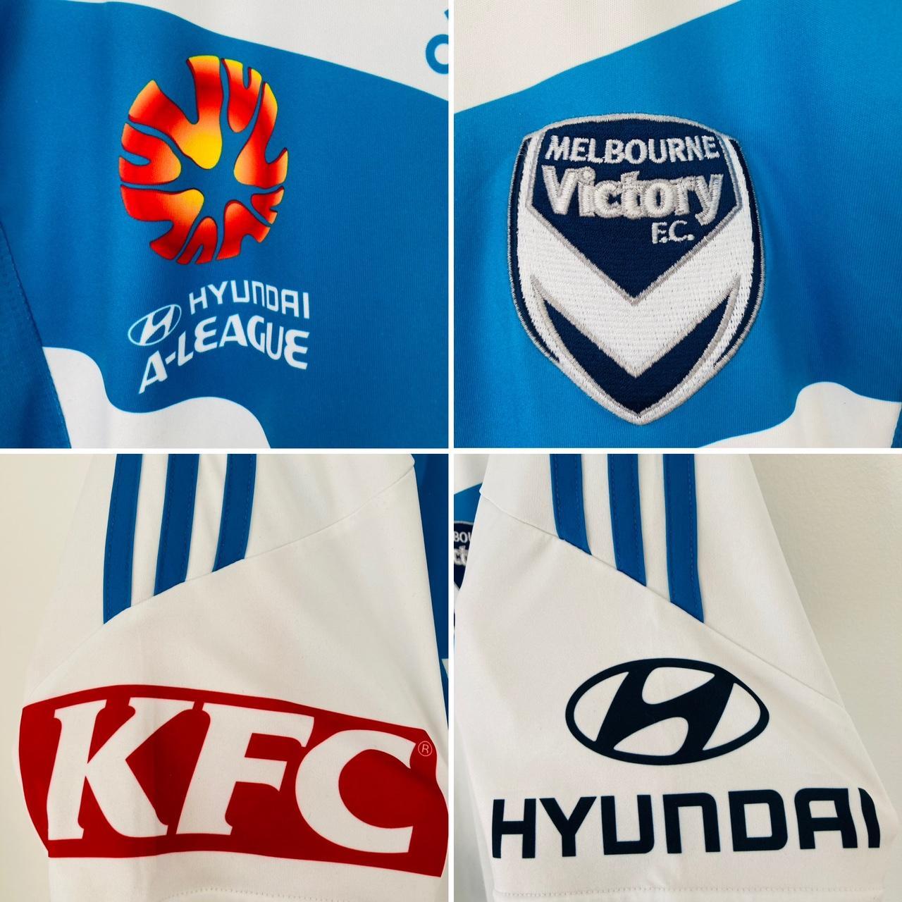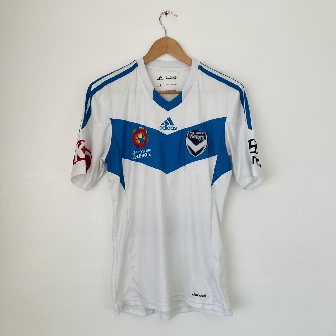 Genuine Melbourne Victory 2014/2015 White Away Football Shirt (S) for sale. Size labeled as adult small but measures 18.5” chest pit to pit and 27” in length. Minor marks, only visible upon close inspection, do not detract from overall good condition. Sponsors are printed onto the shirt and the Victory badge is embroidered.