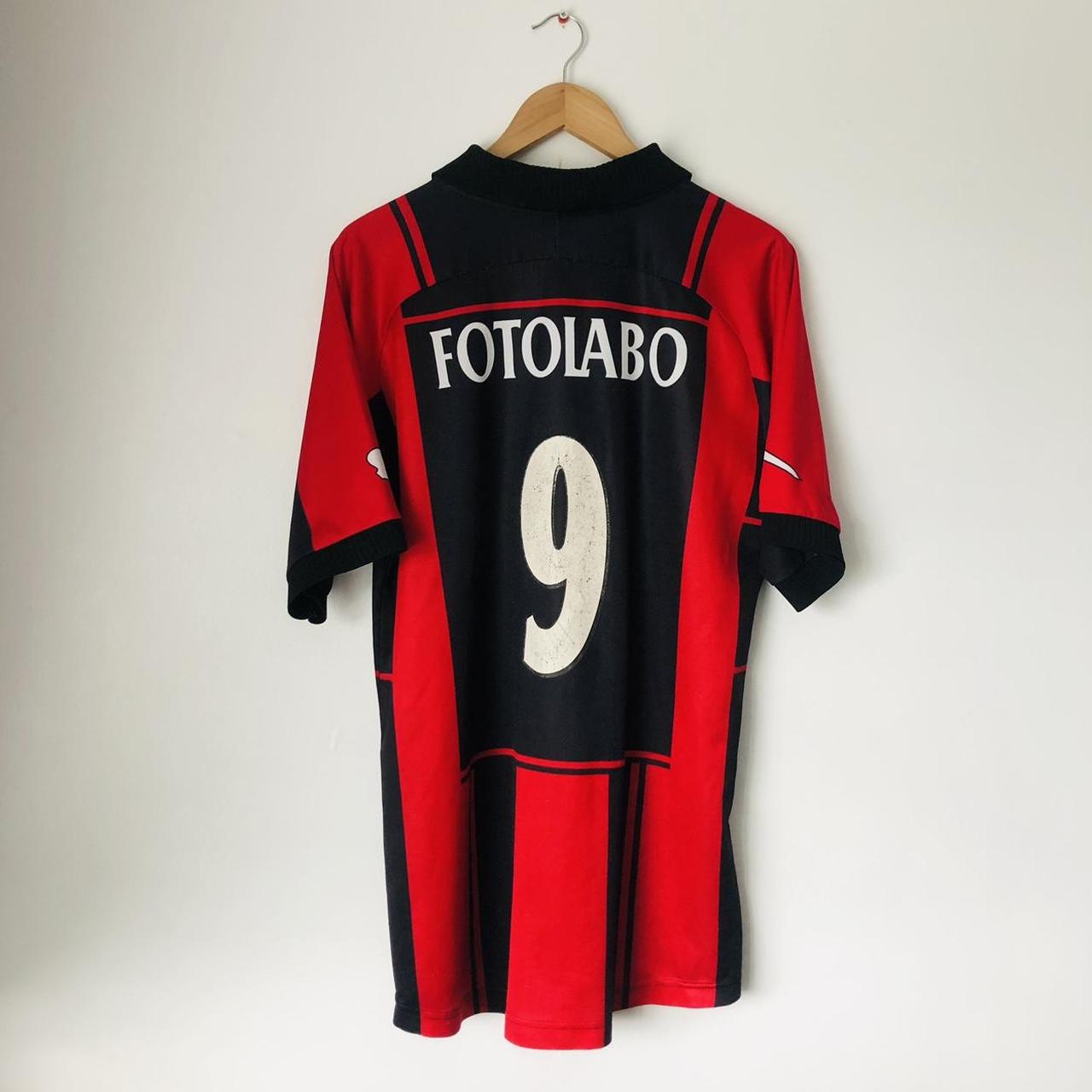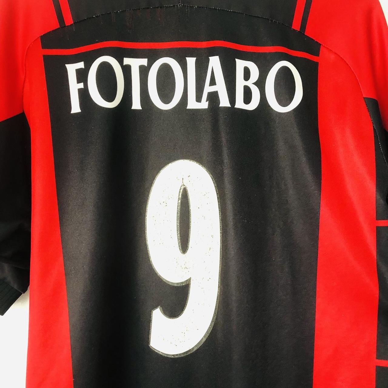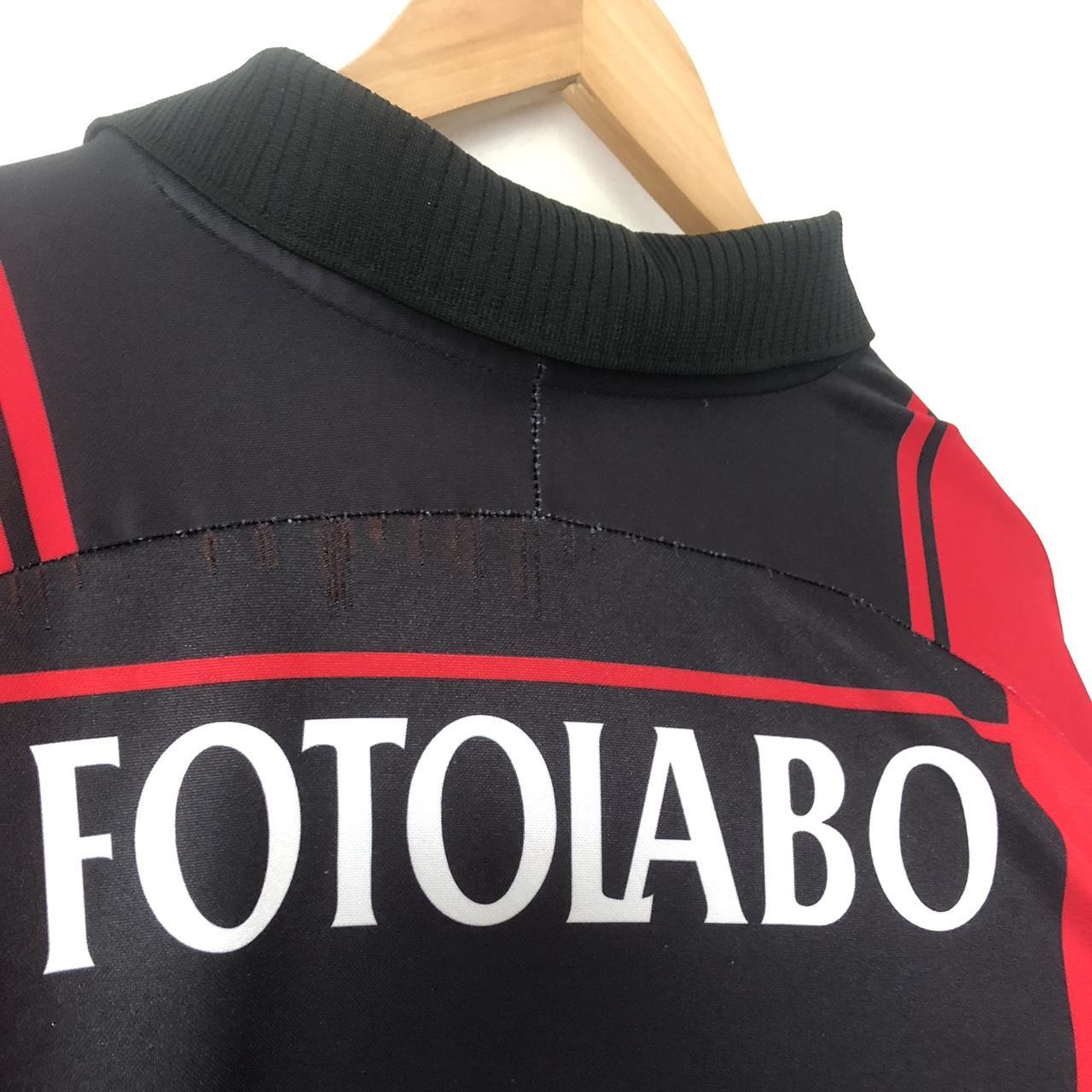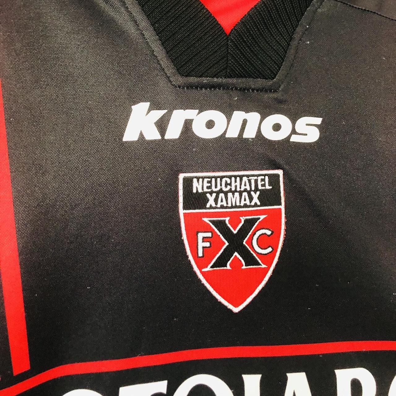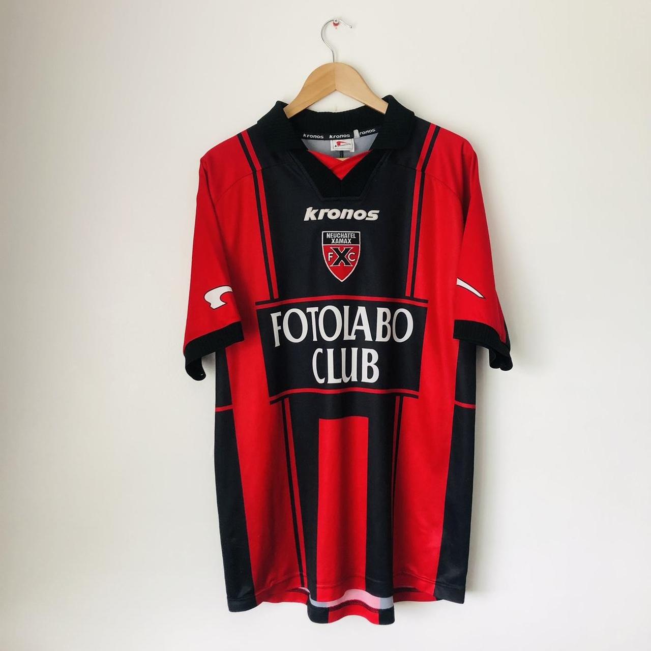 This vibrant red and black Neuchâtel Xamax 2000/2001 home football shirt (size L) will surely ignite your passion for the team. It measures 22" from chest pit to pit and 29" in length, with a 2-inch overhang at the back. Manufactured by Kronos, this shirt has some bobbling and small pulls above the 'Fotolabo' writing on the back. But despite its fair condition, it still represents the pride and spirit of the team, especially with the iconic number 9 on the back.