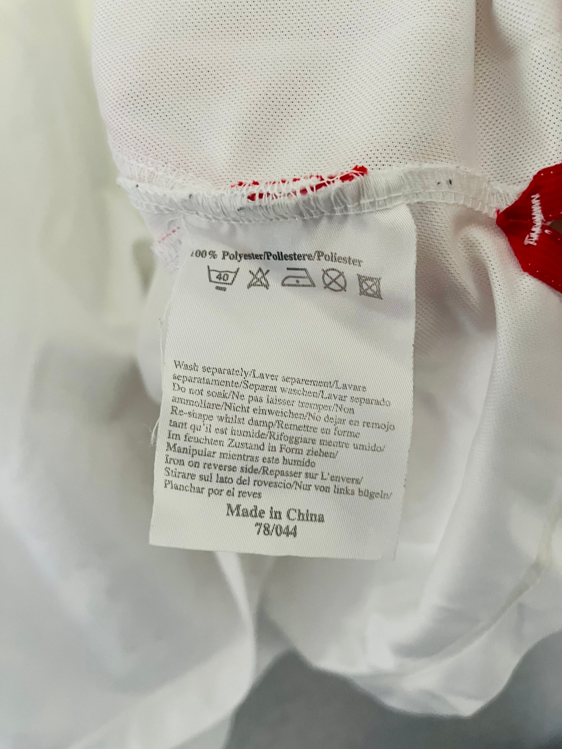This shirt has seen some wear but is still in good condition. There may be some minor flaws such as light fading, small pulls, or faint stains, but these do not detract from the overall appearance or wearability of the shirt. A great choice for those looking to own a piece of football history at an accessible price.