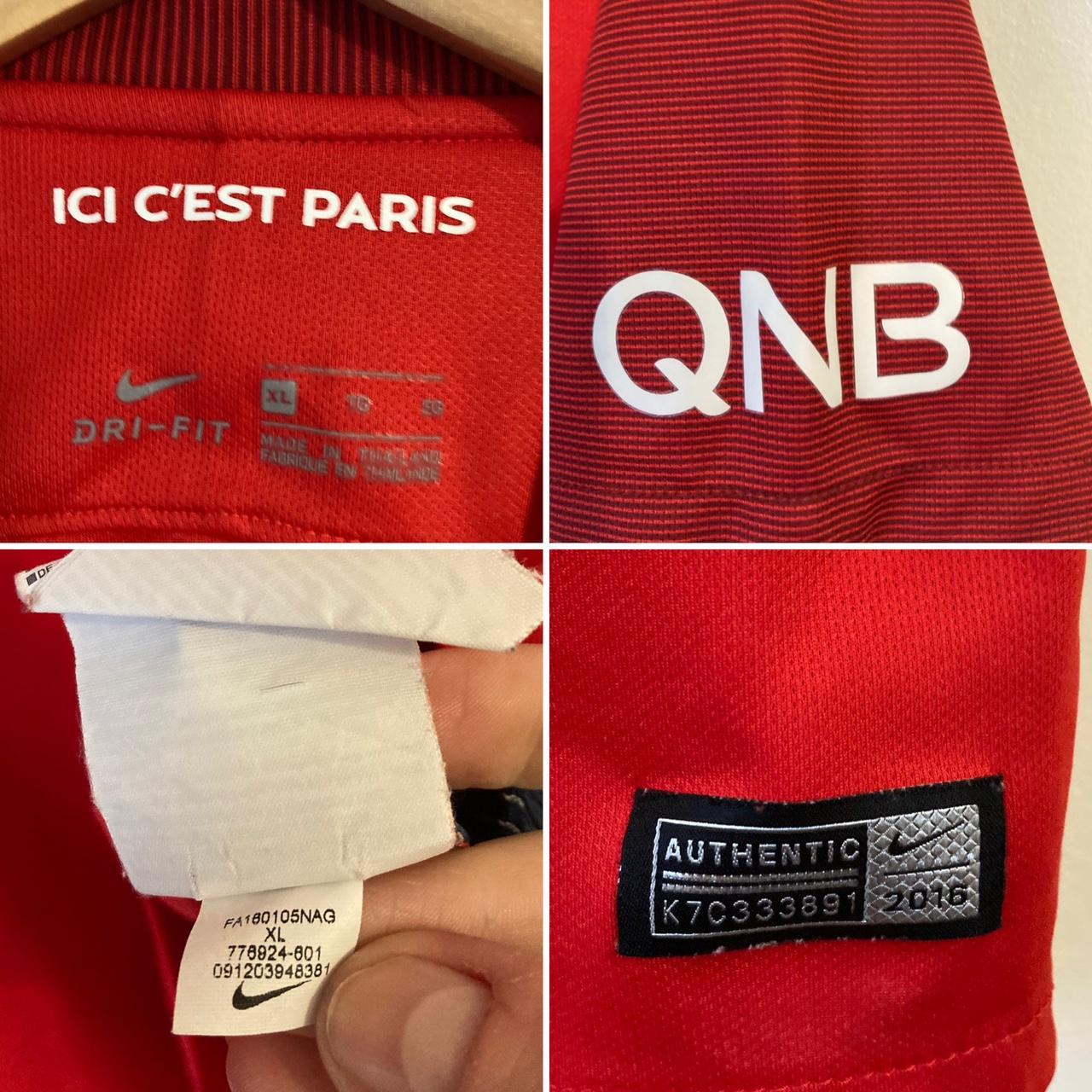 This official PSG away football shirt from the 2016/2017 season is labeled as size XL and measures 22" pit to pit and 28.5" in length. It is in excellent condition and may fit better as an adult large. Genuine and classic, this shirt is a must-have for any fan.
