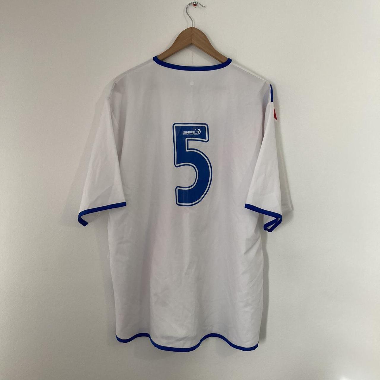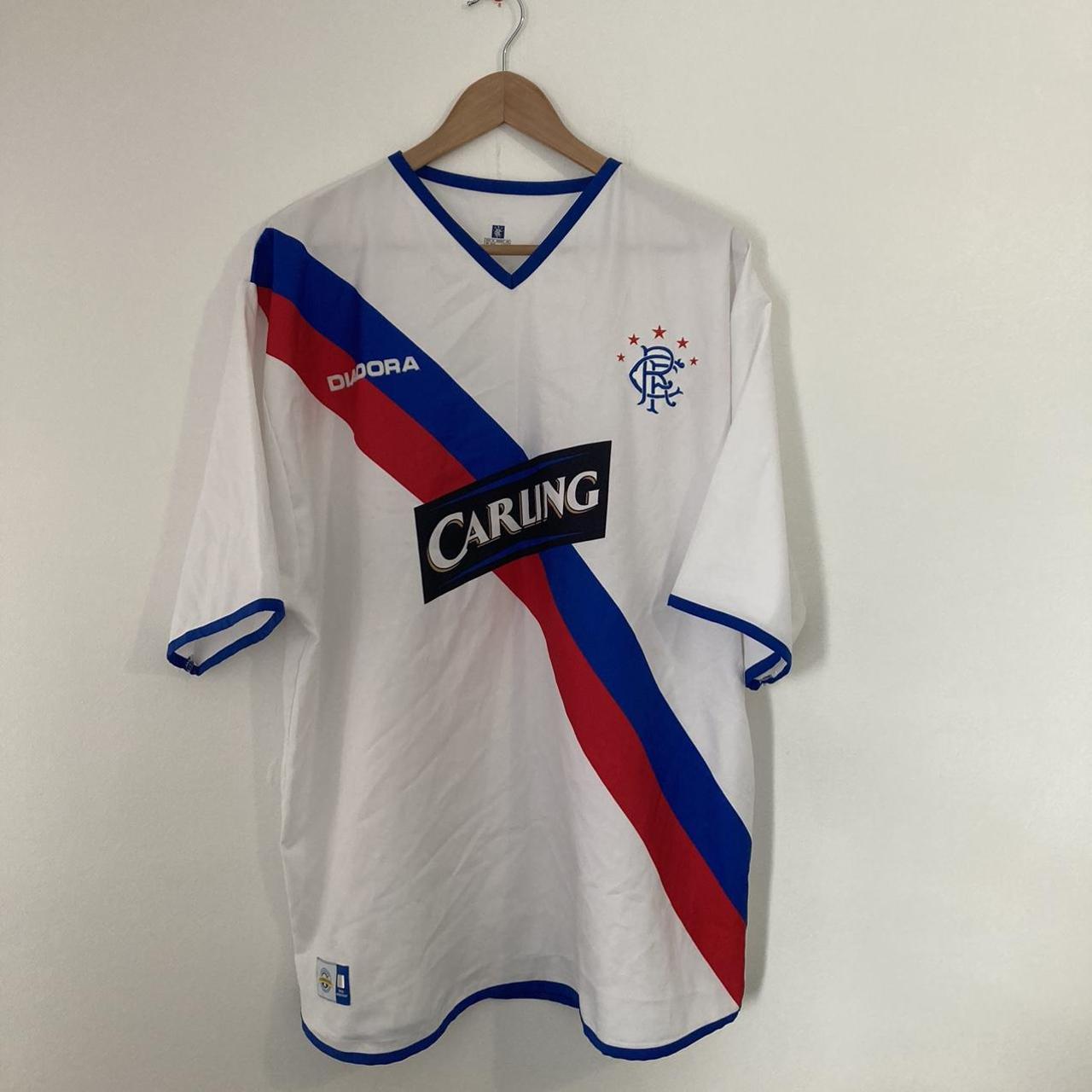 Get your hands on this vintage, genuine, and classic Rangers 2004/2005 white away football shirt in size XL (45/47" label) with a chest measurement of 23.5" and a length of 29.5". The raised felt Diadora logo may show some cracks, but is intact, and the Carling sponsor is printed onto the shirt. It also features the official number 5 on the back and has only one small mark. Overall, this shirt is in great condition.