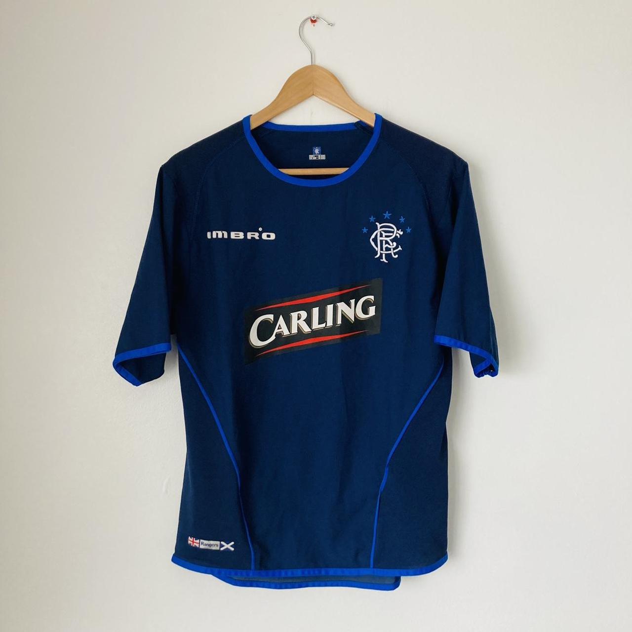 This Rangers 2005/2006 Blue Third Football Shirt (S) is a classic, original vintage piece. It's labeled as size adult small (36/38"), with measurements of 18.5" chest pit to pit and 26" length. The raised felt Umbro logo on the chest has cracks, but the rest of the shirt is in excellent condition.