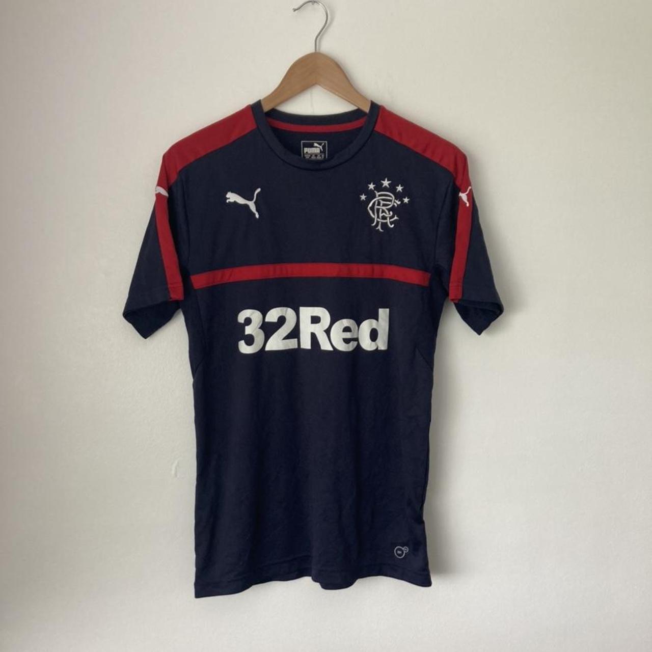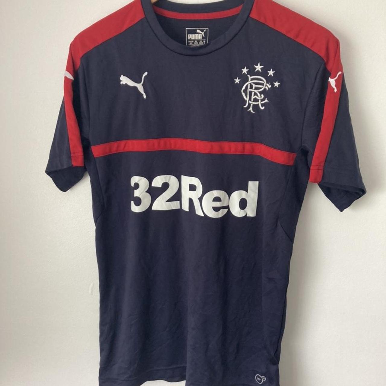 This Rangers third football shirt from the 2015/16 season is a rare, original, and classic piece. It is labeled as an adult medium, but it can also fit as an adult small due to its fitted design. Measuring 18.5 inches from the chest pit to pit and 26.5 inches in length, this shirt is in excellent condition.
