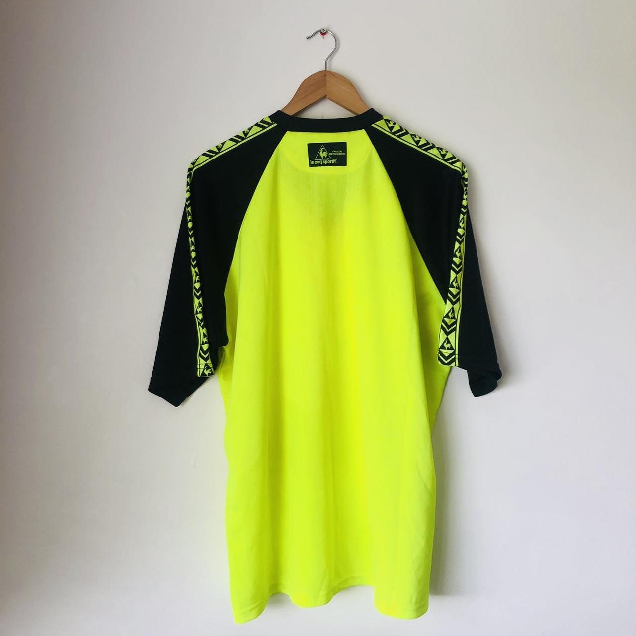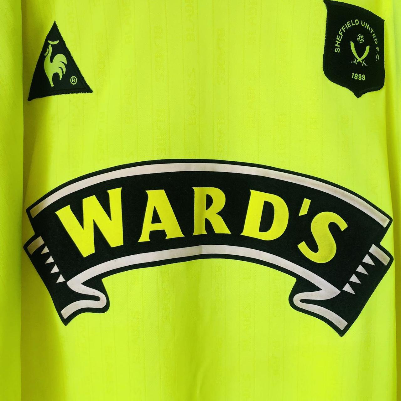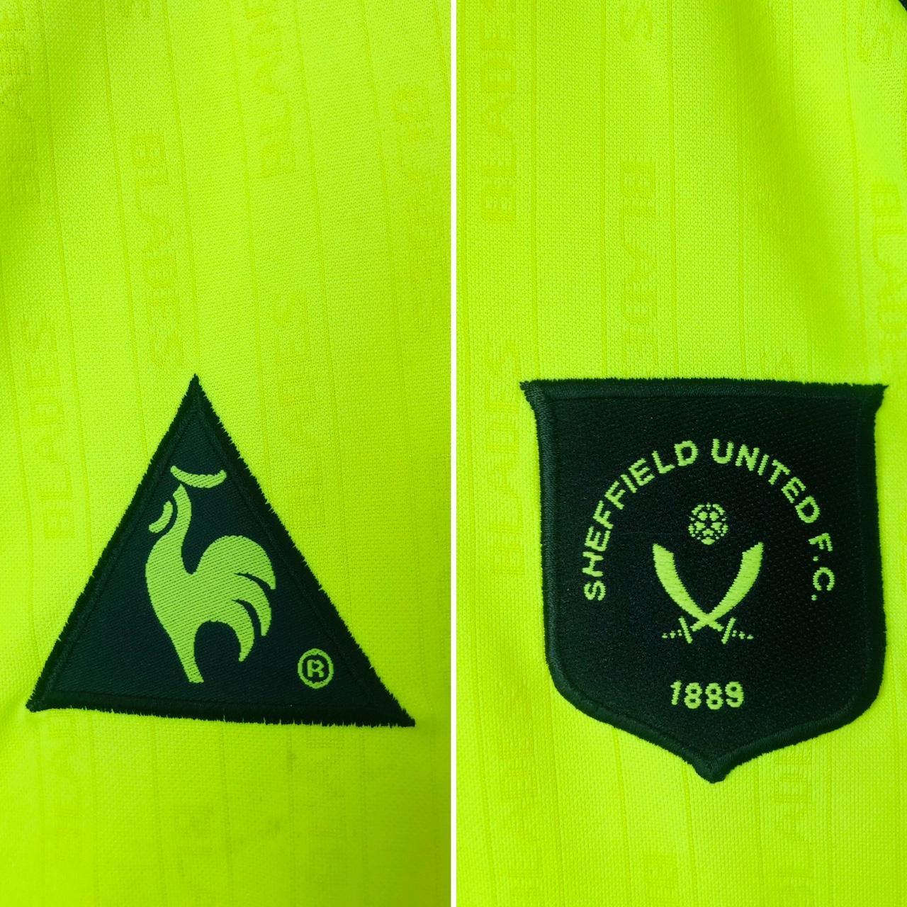 This 1998/99 Sheffield United away football shirt, labeled as adult large (42/44”), measures 24.5” in the chest pit to pit and 29.5” in length. Although it is listed as a large, it fits more like an XL with some room. The shirt, made by Le Coq Sportif in the UK, is in excellent condition and appears to have been barely worn.