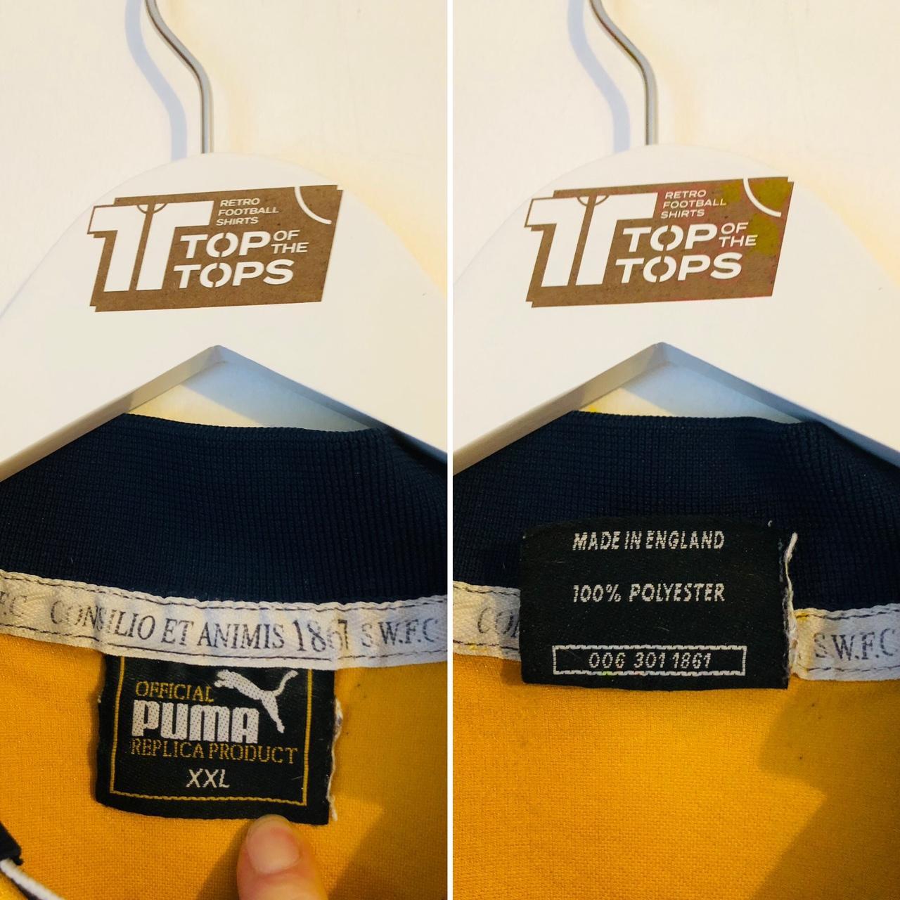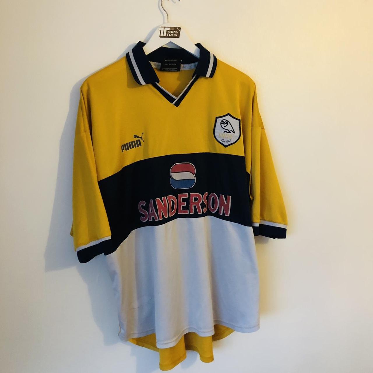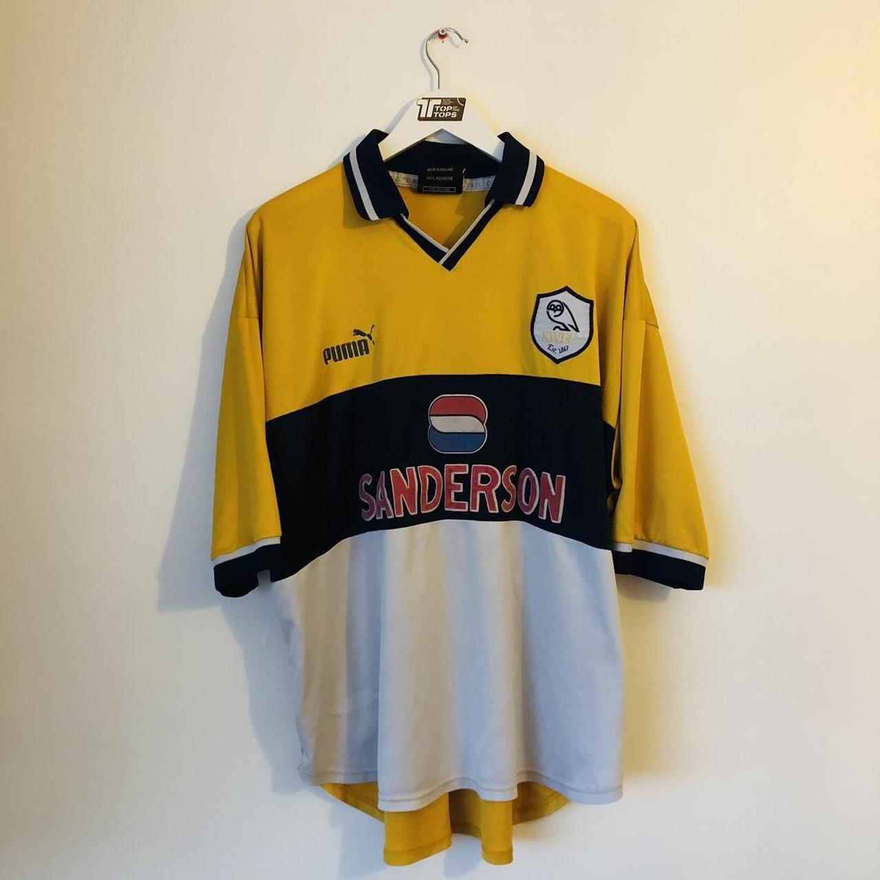 Genuine vintage Sheffield Wednesday away football shirt from the 1999/2000 season, in adult XXL. Measures 26.5" pit to pit and 28" in length, with a slight overhang at the back. Some slight wear to the Puma logo and missing logo at the hem, but overall in good condition for its age. Original shirt made in the UK by Puma in 1999.
