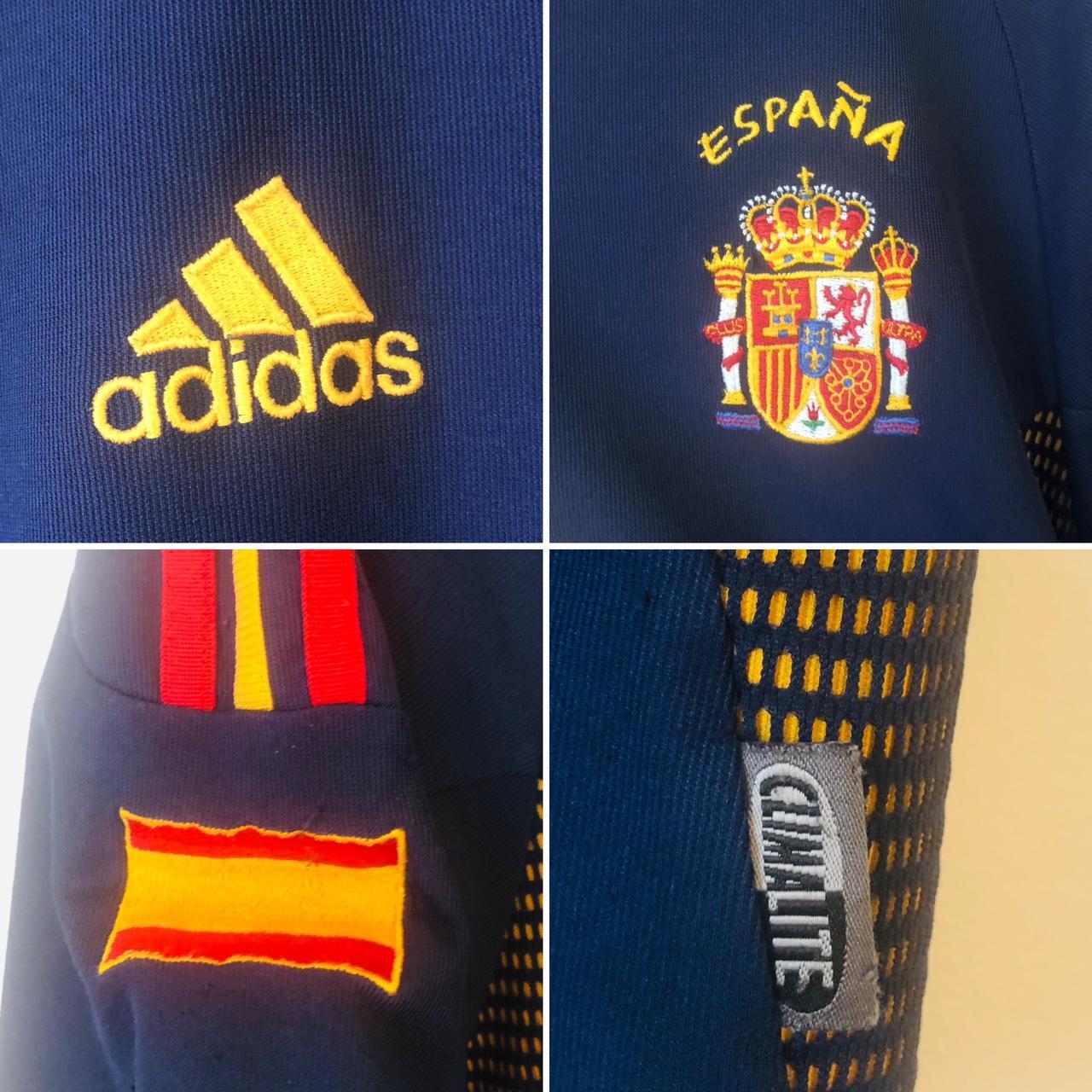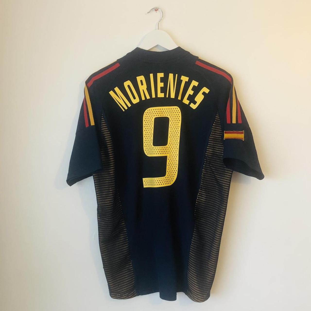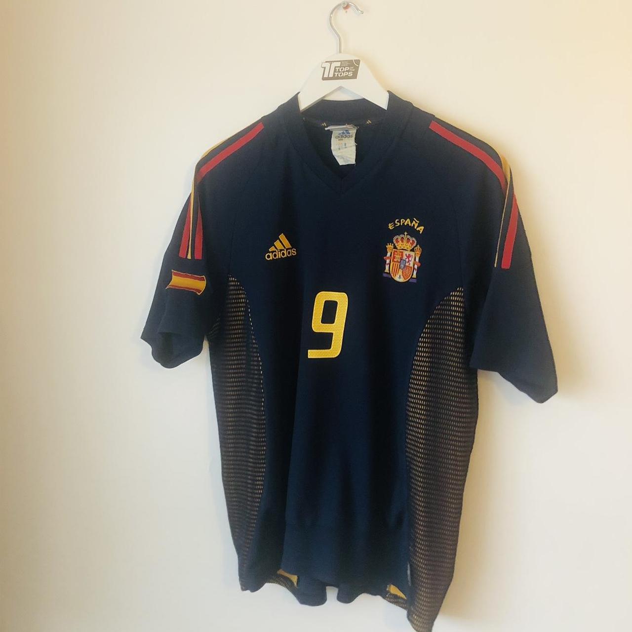 This Spain 2002 Navy Third Football Shirt (M) is made by Adidas and features player Fernando Morientes' number 9. It is an adult medium size and measures 21.5" chest pit to pit and 27" in length with a 2 inch overhang at the back. The shirt is in excellent condition with only a few minor bobbles. Product code: 298467.