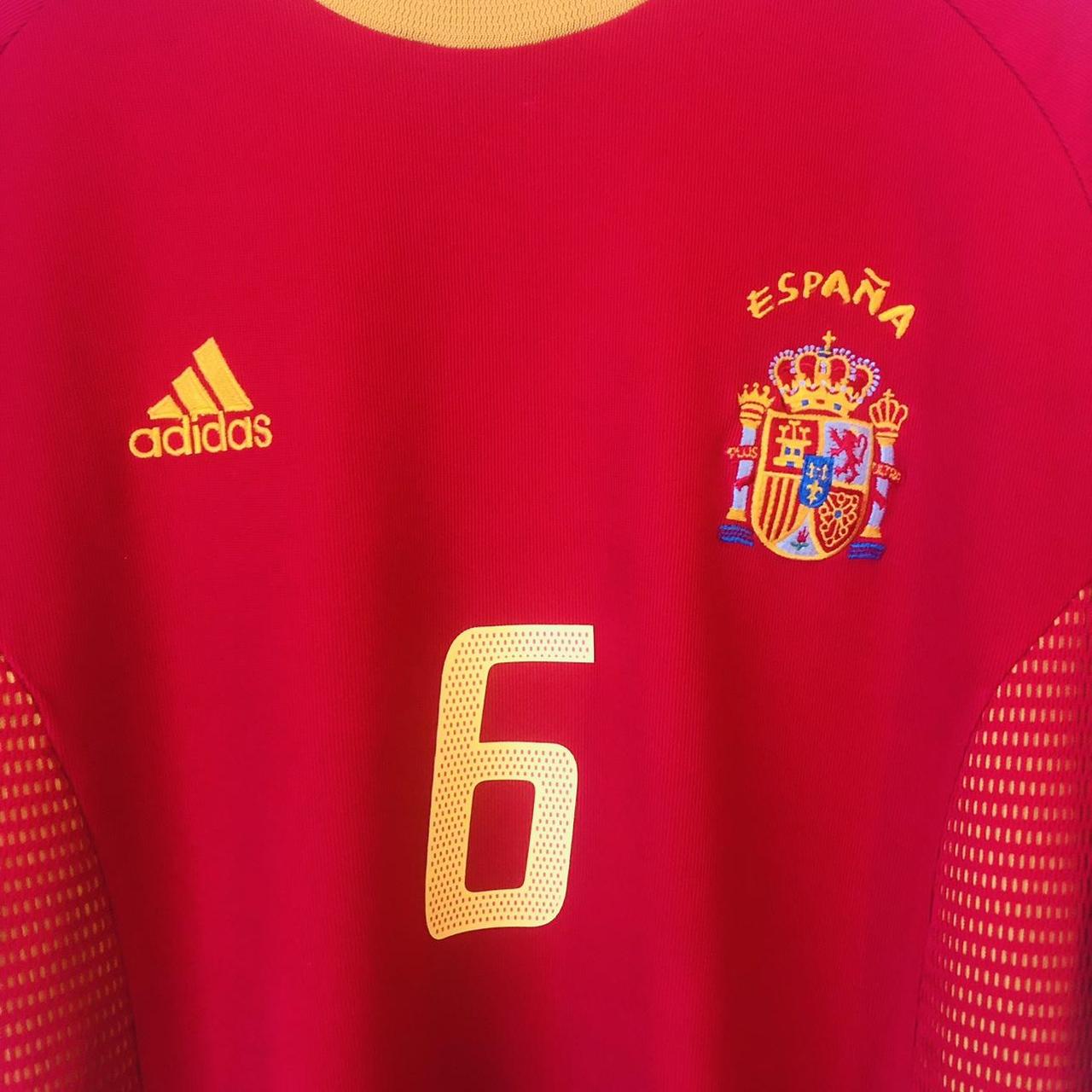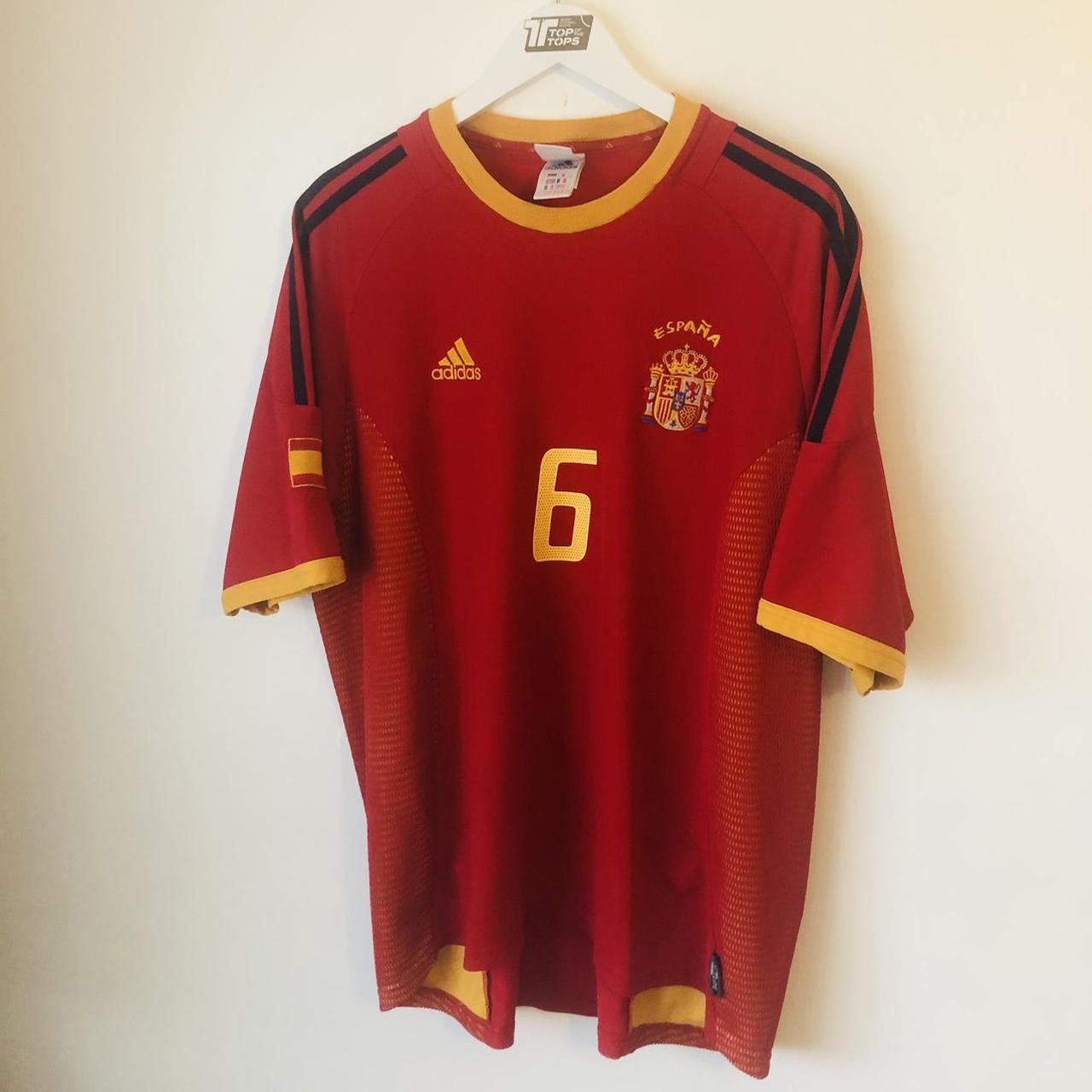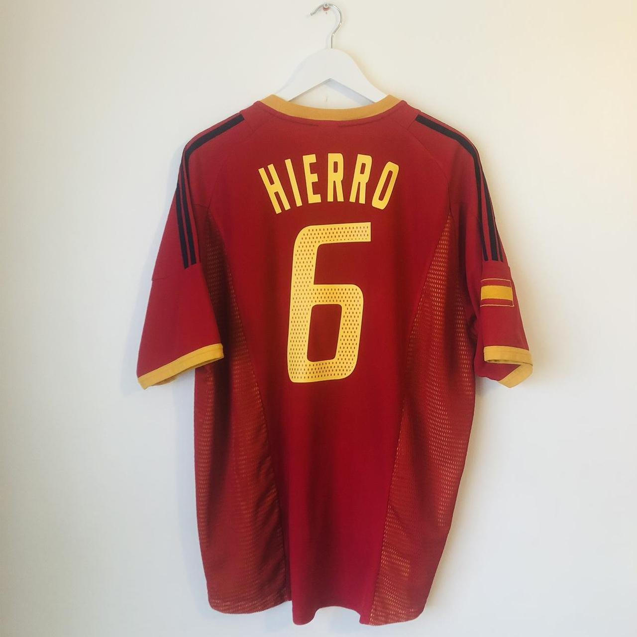 This is a Spain home football shirt for sale, featuring Fernando Hierro as player number 6 and representing the 2002 World Cup. It is an adult size XL, measuring 24 inches from chest pit to pit and 28 inches in length. There is a 2 inch overhang at the back of the shirt. Made by Adidas, the shirt is in excellent condition with a product code of 298547.