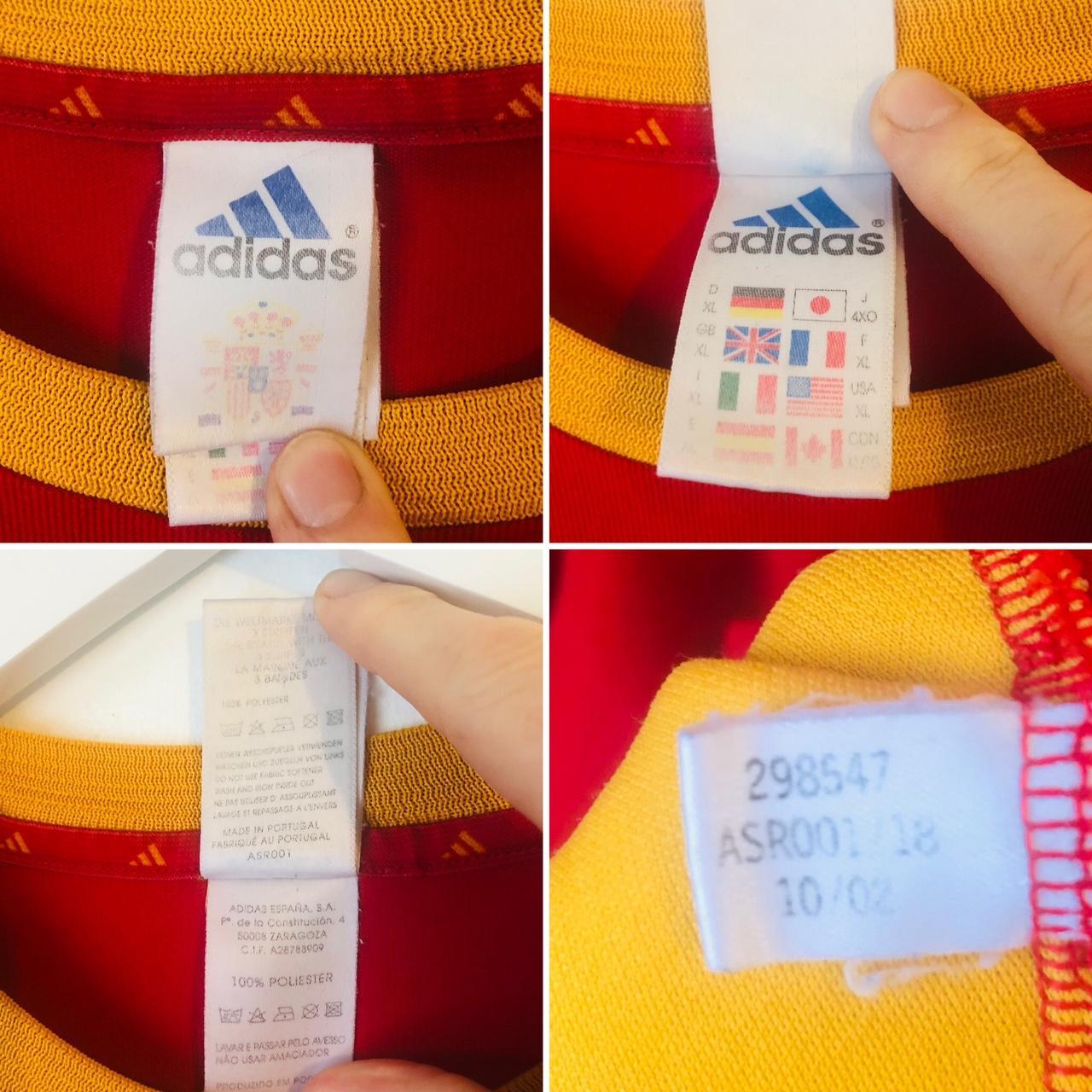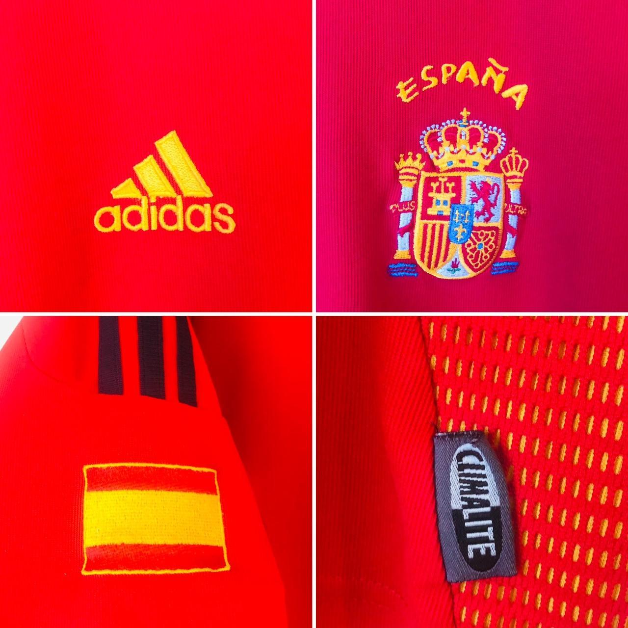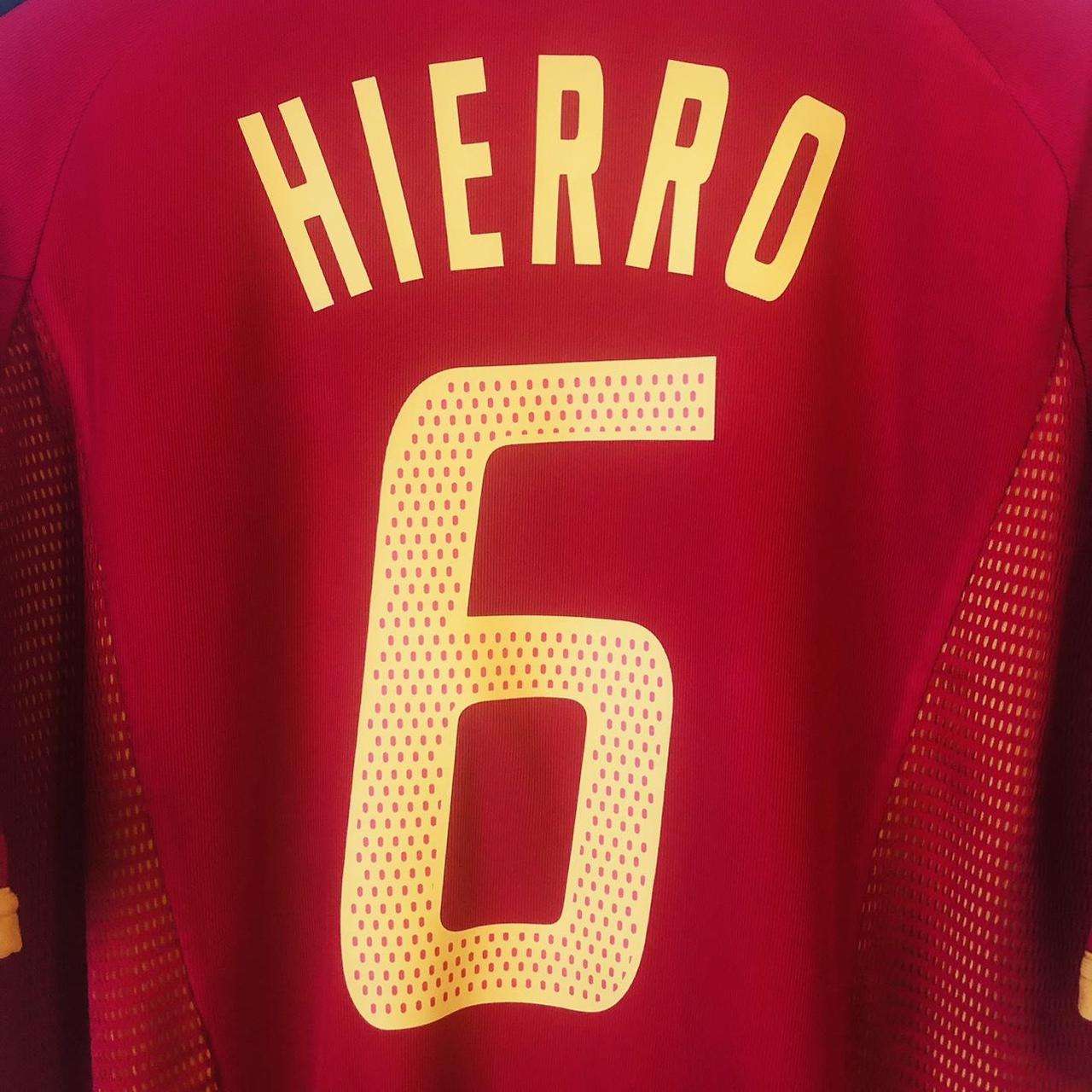 This is a Spain home football shirt for sale, featuring Fernando Hierro as player number 6 and representing the 2002 World Cup. It is an adult size XL, measuring 24 inches from chest pit to pit and 28 inches in length. There is a 2 inch overhang at the back of the shirt. Made by Adidas, the shirt is in excellent condition with a product code of 298547.