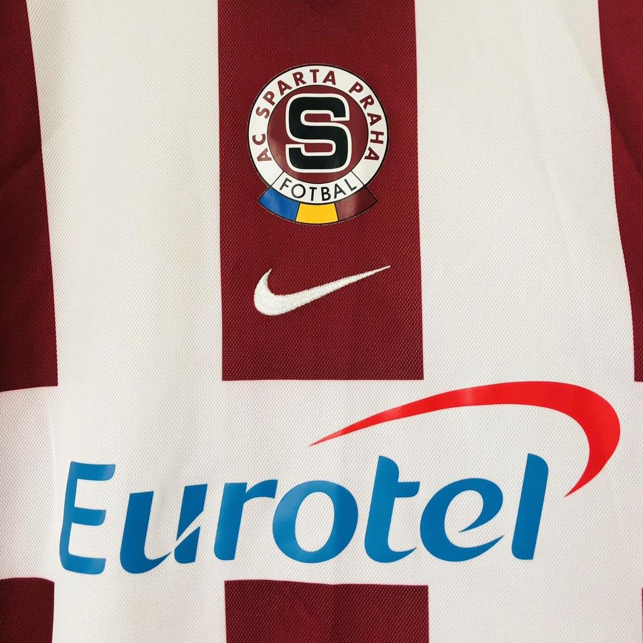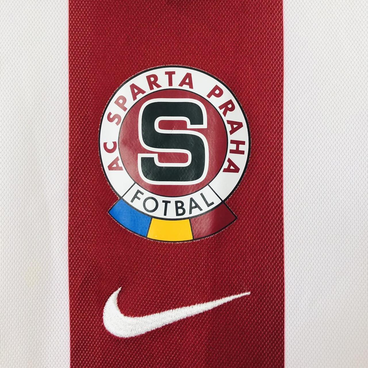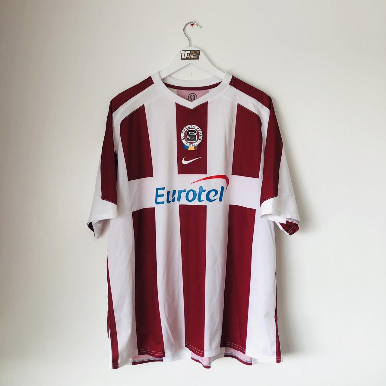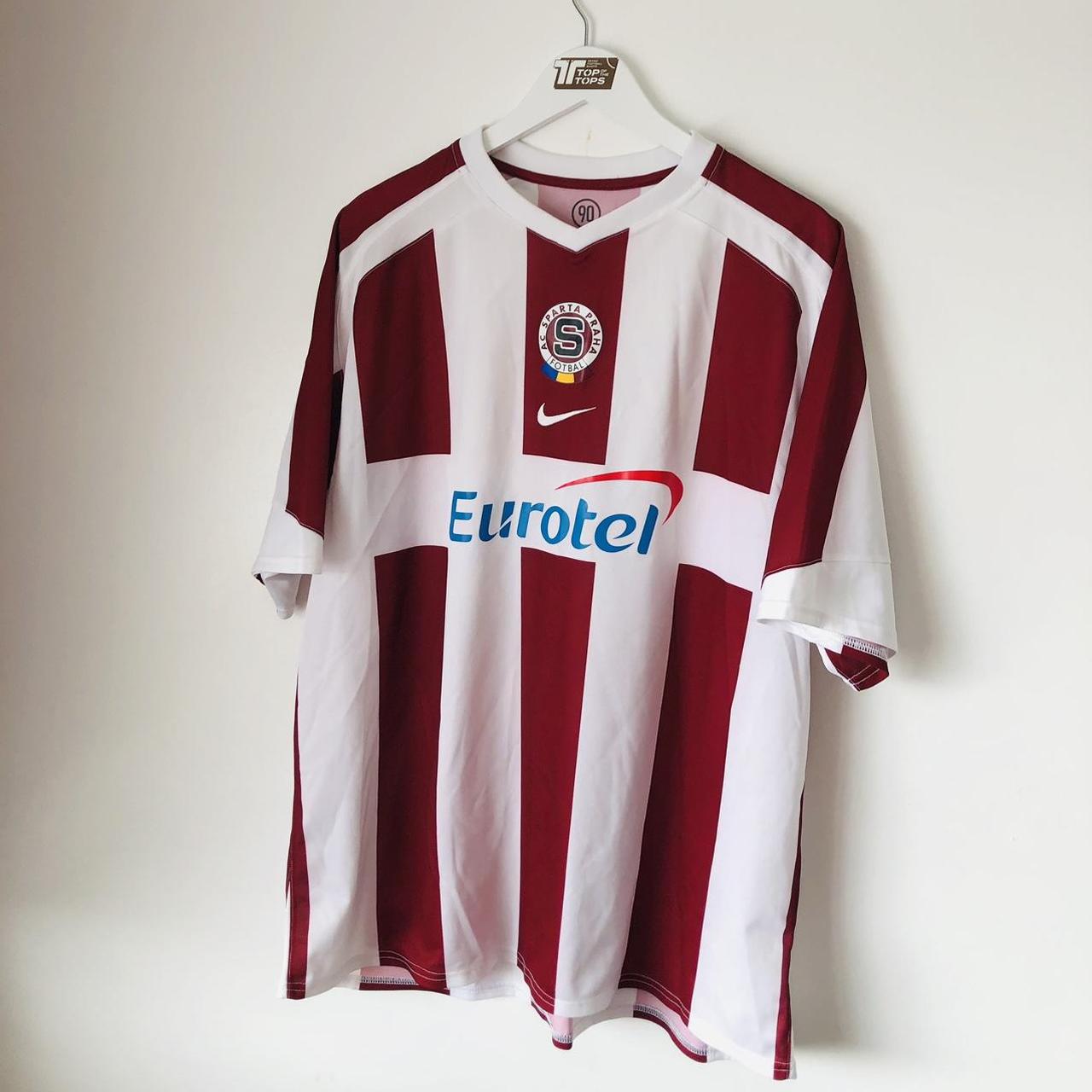 This Sparta Prague 2005/2006 Red & White Away Football Shirt (XXL) is up for sale. It features the team's logo and is from the 2005/06 season. The size is XXL and measures 47/48" in chest pit to pit and 30" in length. Made by Nike, it is in excellent condition with just a few barely noticeable dot marks. The product code is 195860, and all shirts are guaranteed to be authentic and genuine from their respective release year.